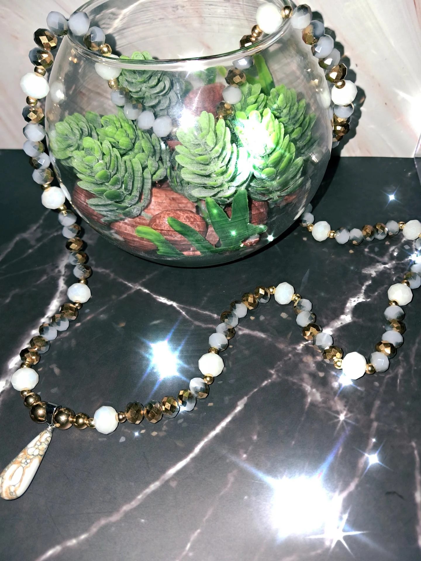 Collier raffiné en perles de verre facettées marbré de blanc et de doré, sublimé de perles d'hématite dorée et un pendentif en pierre naturelle assortie.