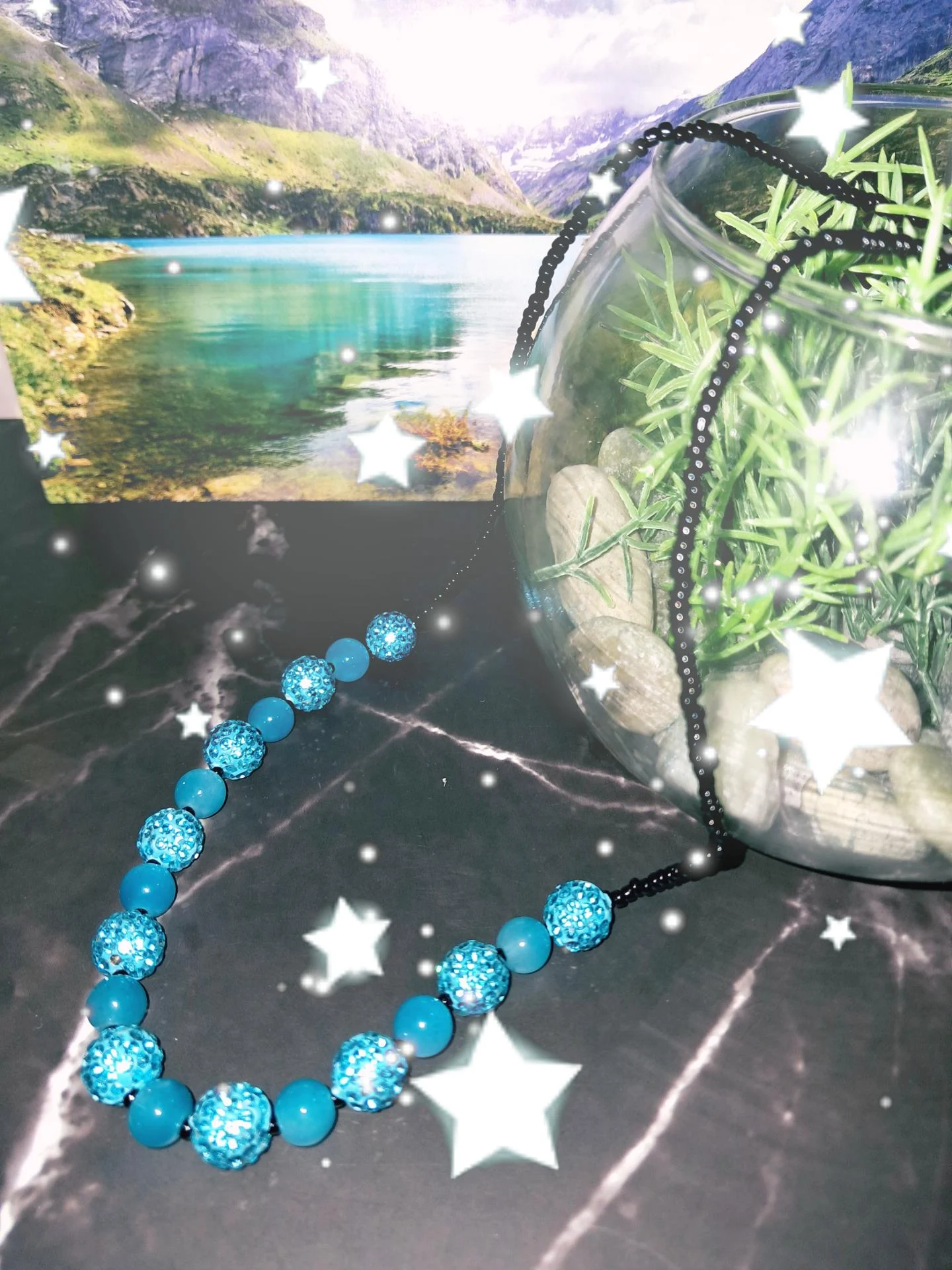 Collier raffiné composé de rocaille noires,de perles bleu ciel en verre et de perles bleues en strass très brillantes.