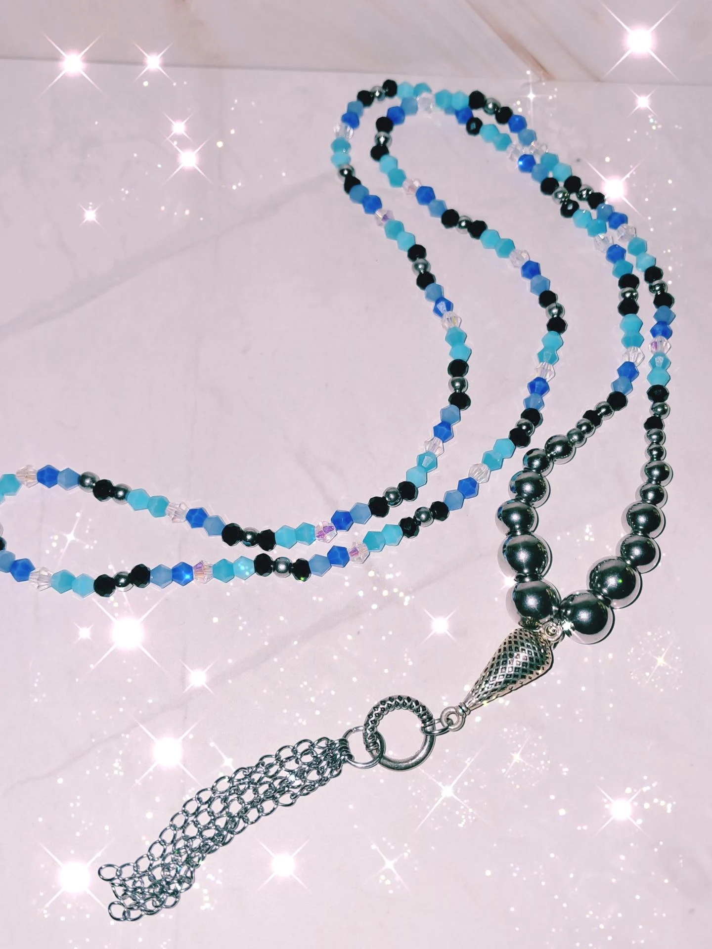 Collier raffiné fait main ,composé de perles en verre aux quatre tons de bleu, noir et blanc transparent.Finitions & pendentif en acier inoxydable.