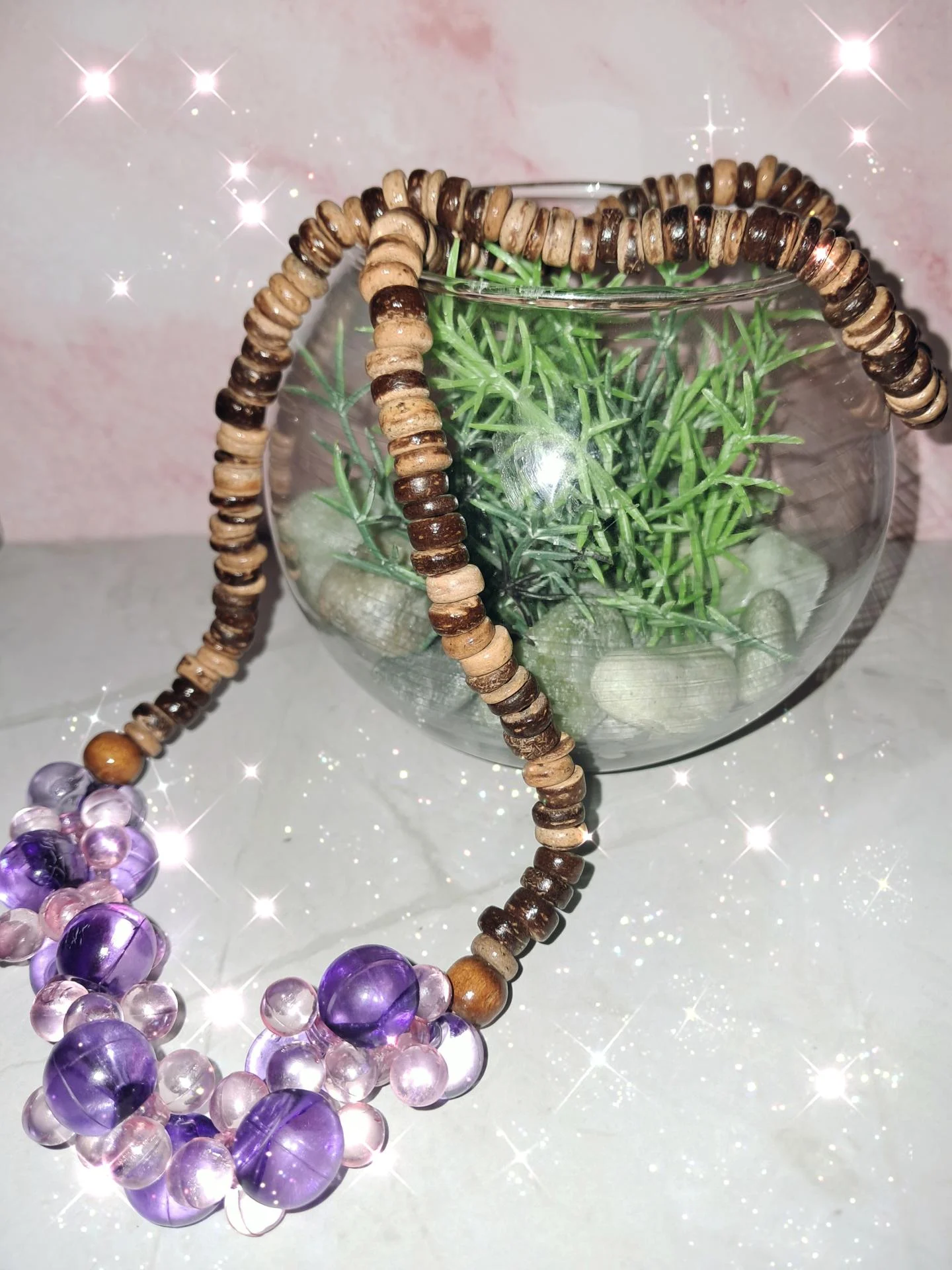 Collier artisanal composé de perles de coco vernies et d'un magnifique pendentif de grappes violette et rose en perles d'acryliques.Une pièce bohème ,lumineuse et pleine de charme,idéale pour apporter une touche tropicale et féminine à toutes vos tenues