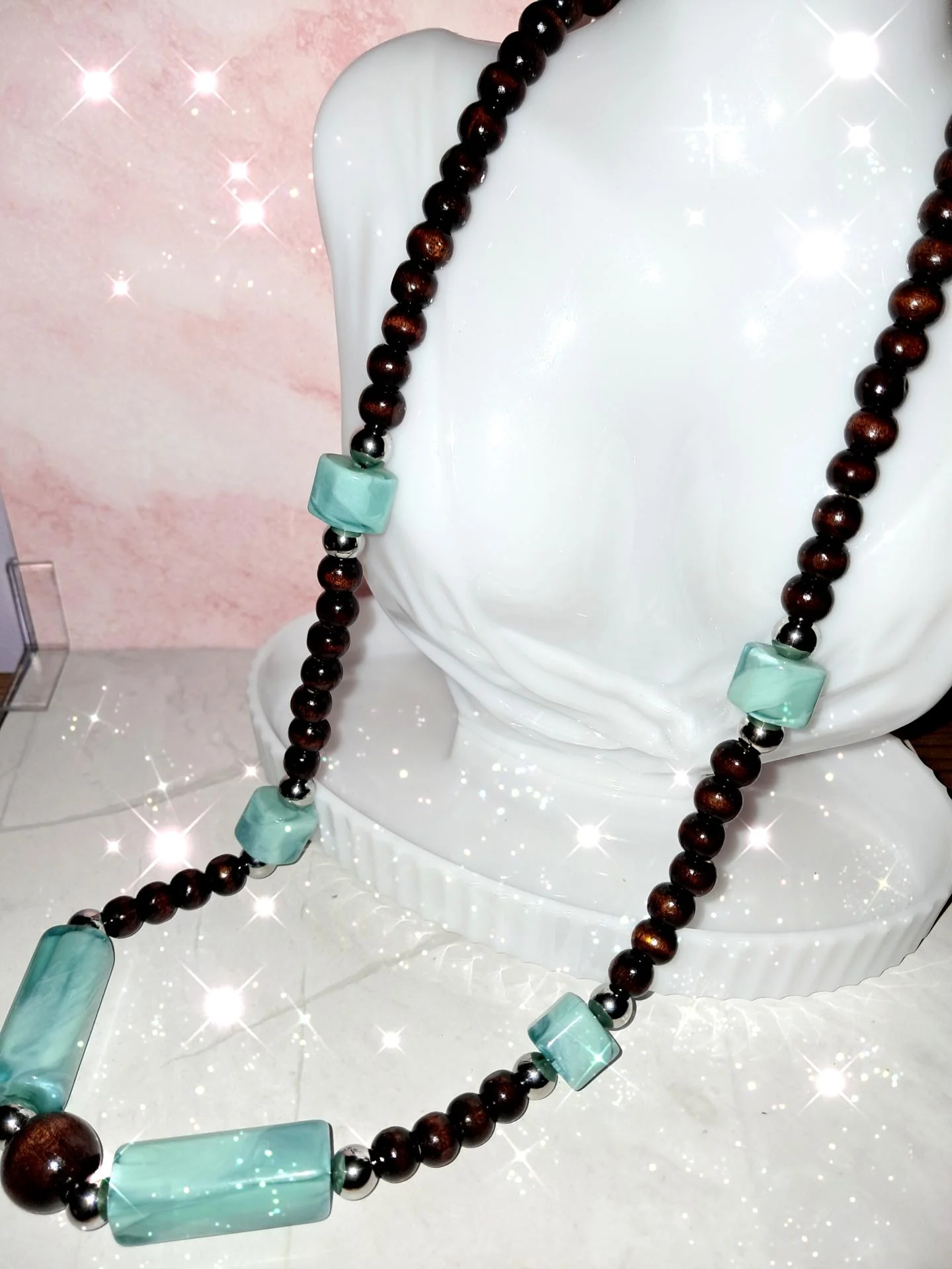 Collier artisanal mélant perles en bois marron foncé,résine bleue marbrée et acier inoxydable argenté.Un style naturel,moderne et chaleureux