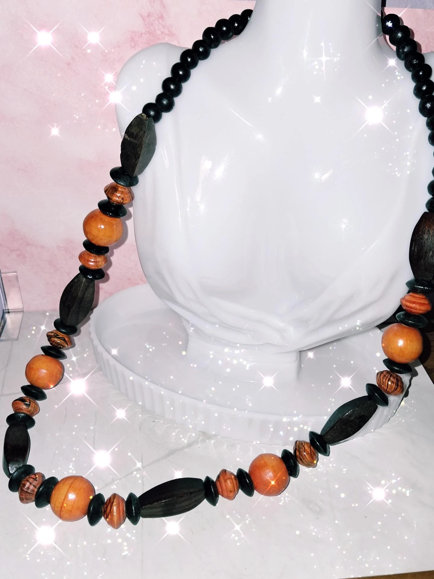 Collier tout en bois verni ,aux couleurs chaudes : marron sombre,marron clair,marron orangé.Un collier qui se porte en toutes saisons ,se marie aussi bien avec un décolleté qu'avec un col roulé.
