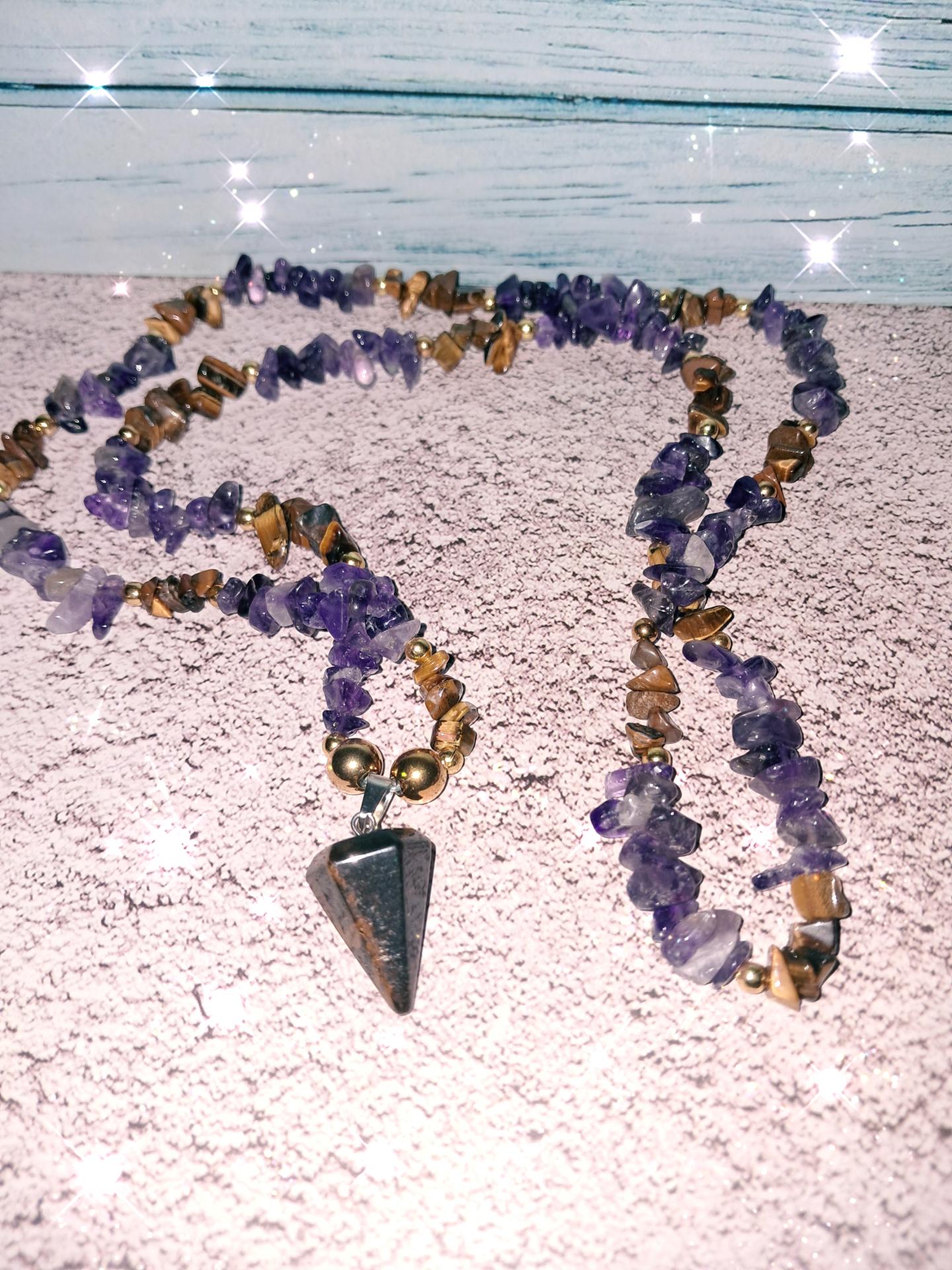 Long collier en pierres naturelles d'oeil de tigre & d'améthyste,orné d'un pendentif en pointe d'oeil de tigre.Un bijou entre force & sérénité.