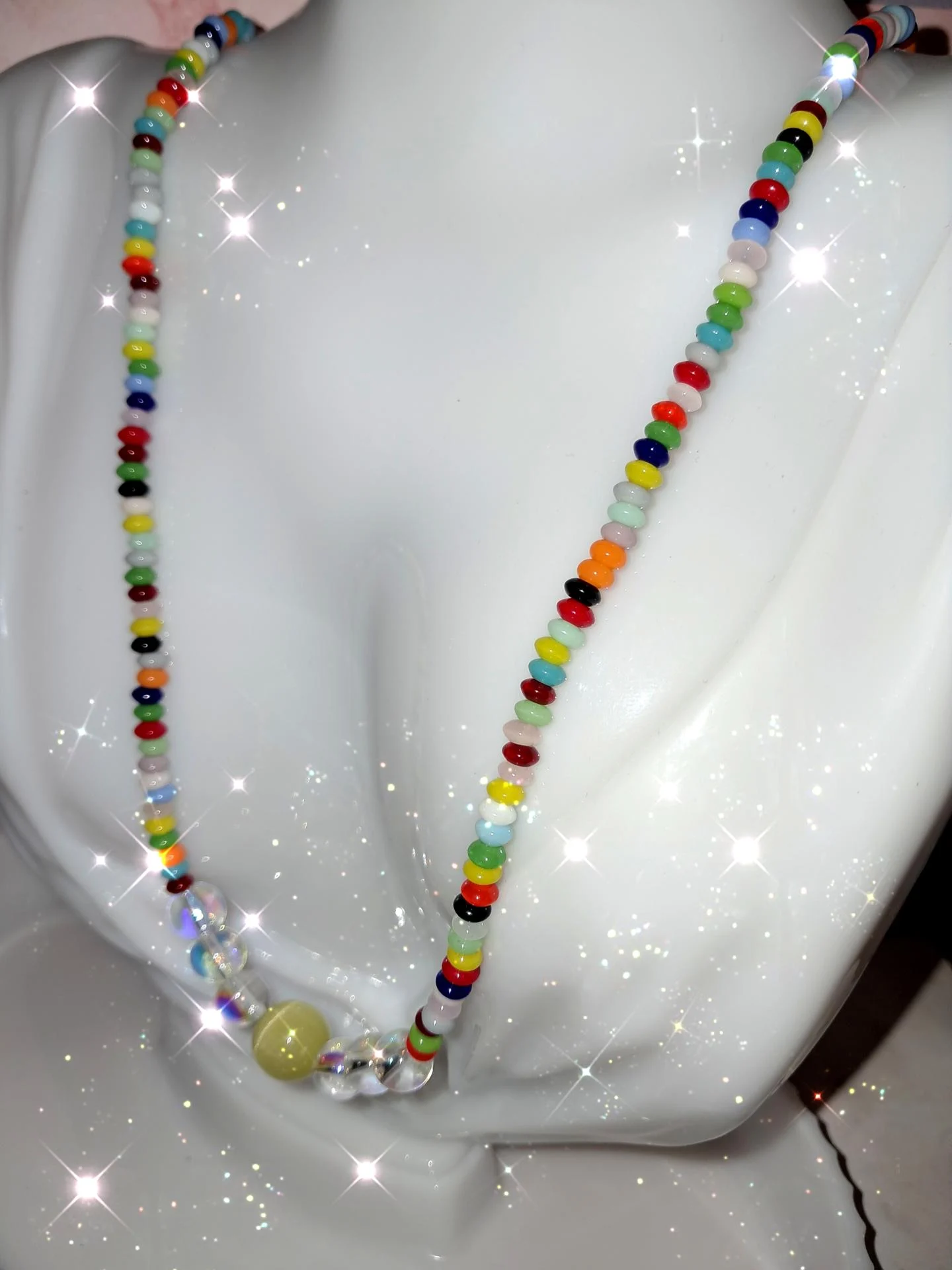 Collier lumineux et multicolore en perles abacus,sublimé par une perle centrale oeil de chat jaune et des perles réfléchissantes effet arc en ciel