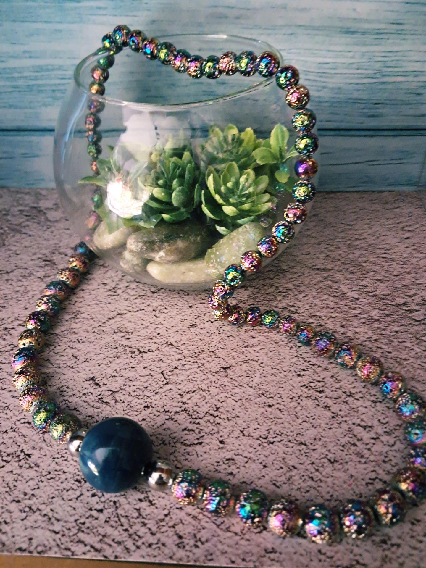 Collier en pierre de lave teintée aux reflets arc en ciel,agrémenté d'un pendentif boule en acrylique bleu marine & de deux perles inoxydables argentées. Un bijou éclatant & moderne,parfait pour toutes les occasions.