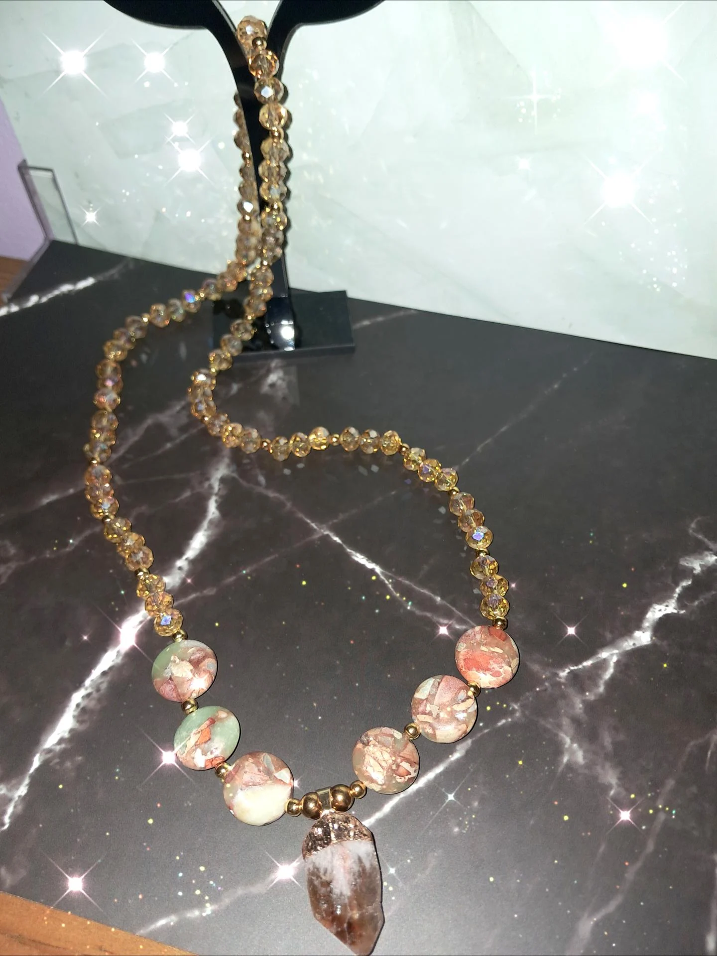 Collier en pierre Jaspe serpent perles en cristal facetté couleur champagne & Quartz fumé