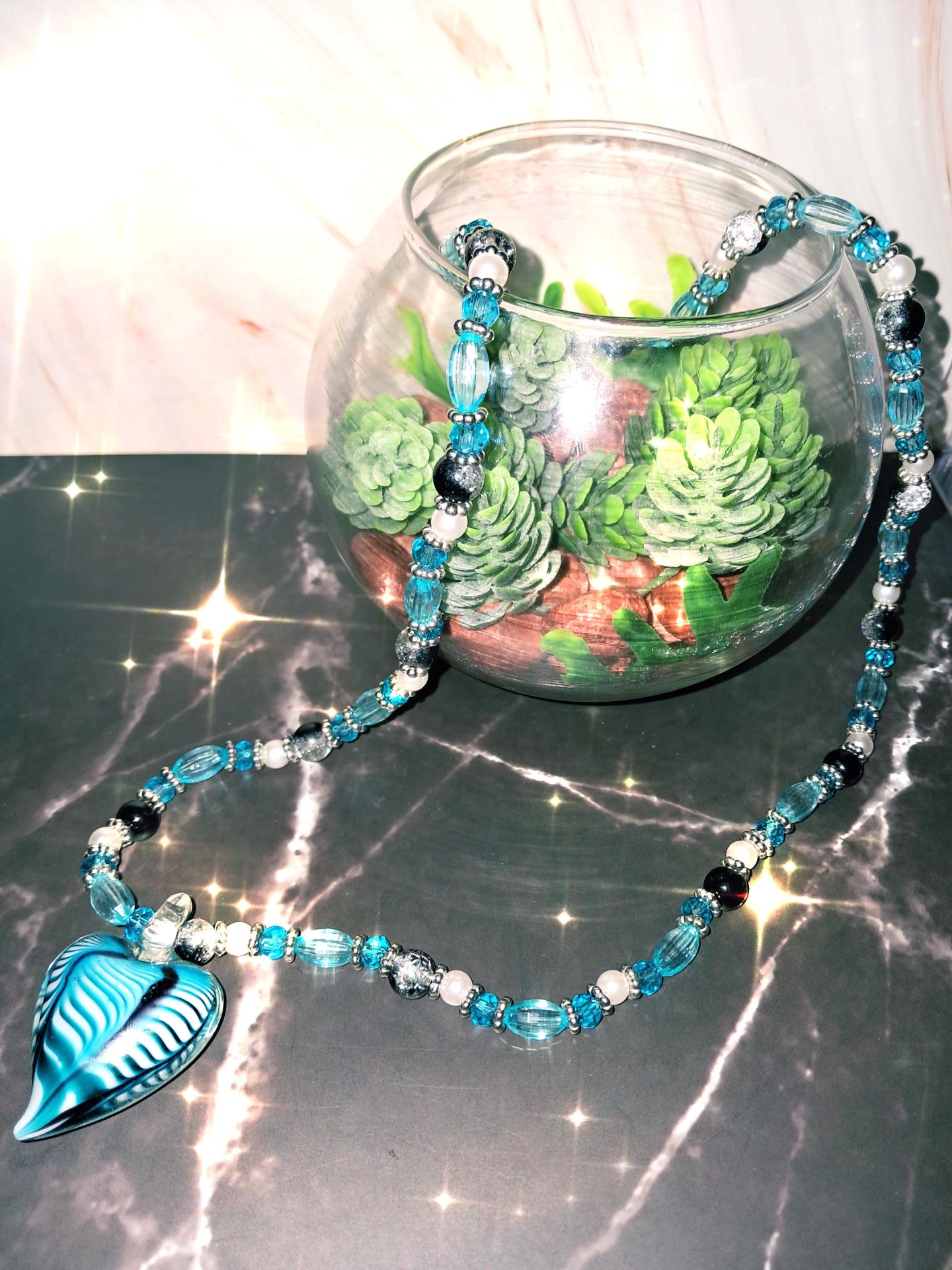 Collier en verre fauté bleu ciel avec pendentif coeur en verre soufflé