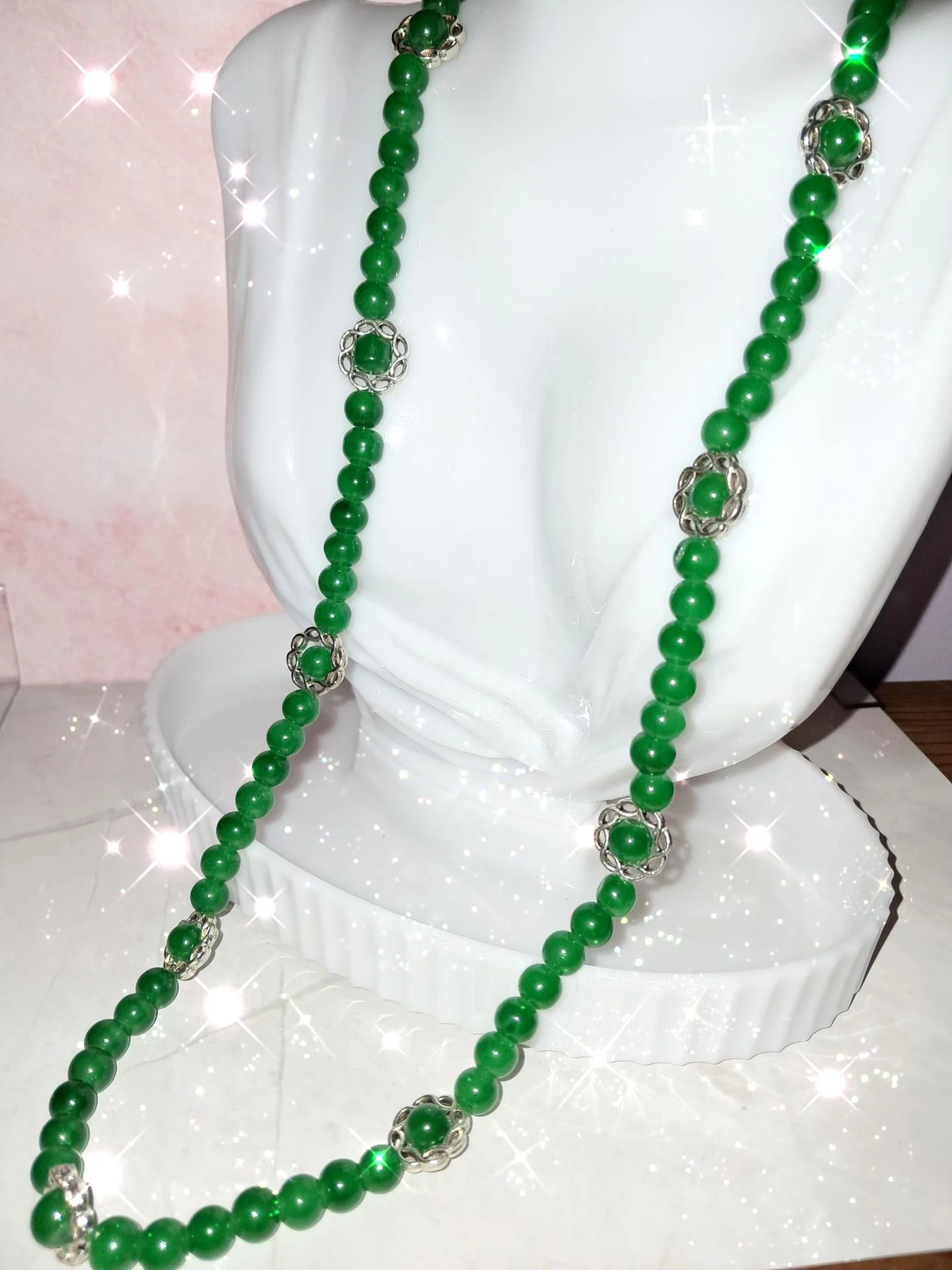 Collier simple et raffiné ,composé de perles en verre de couleur vert émeraude et un design sublimé par de jolies fleurs en alliage de zinc.