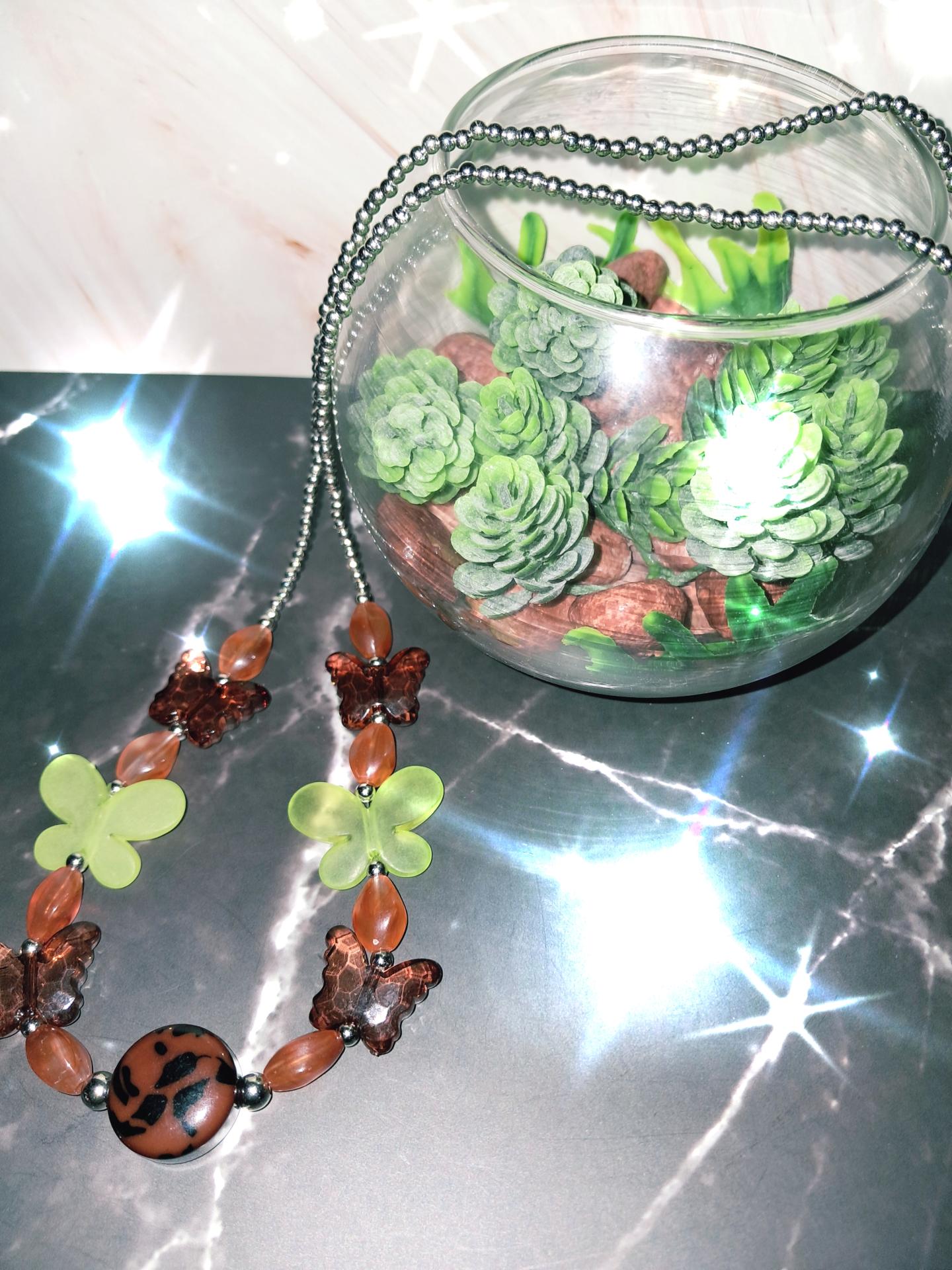 Collier entierement acrylique aux papillons ambrés et verts