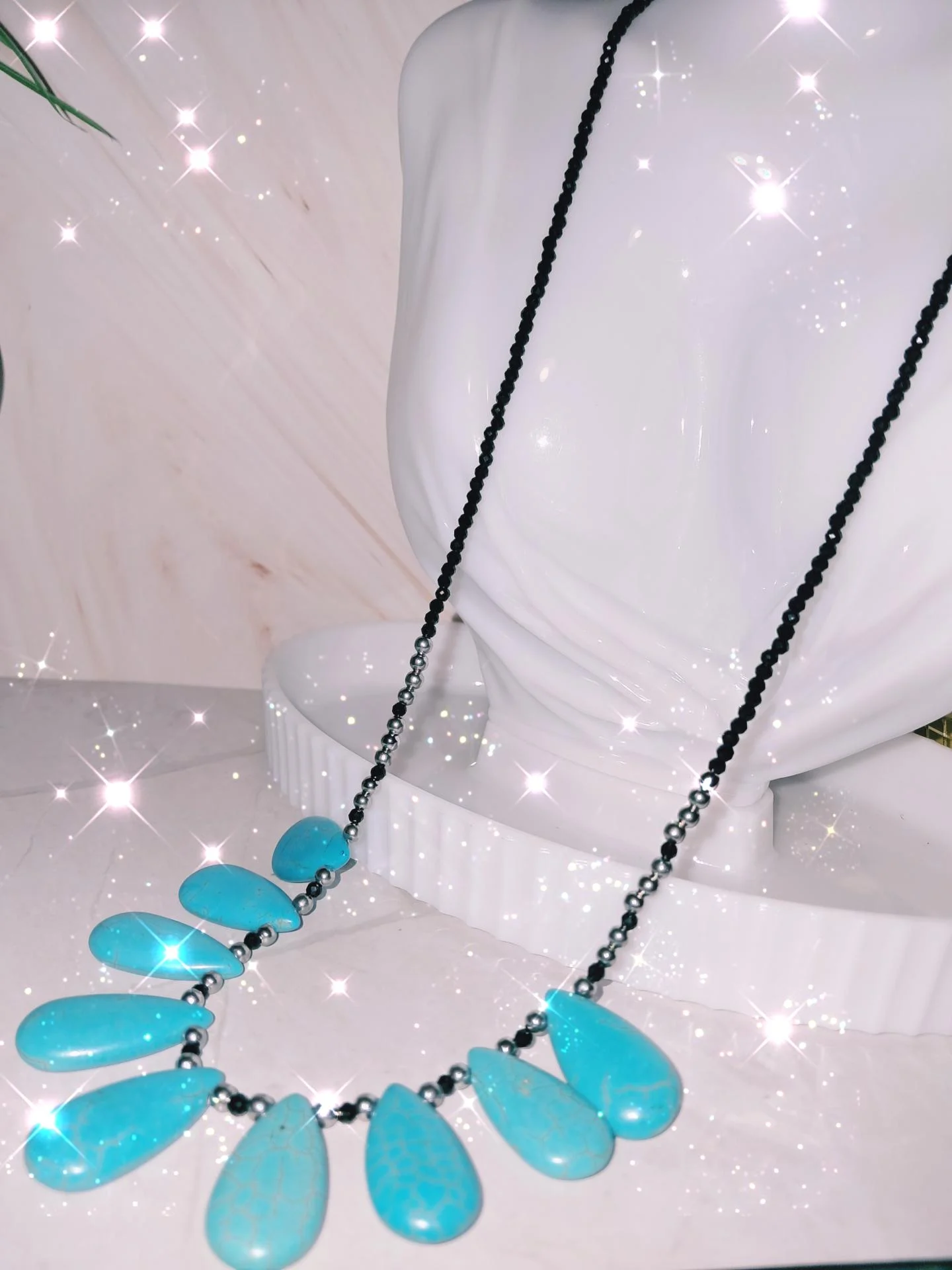 Ce collier élégant va vous séduire avec ses larmes de pierre imitation turquoise ,orné de perles noires de 4 mm facettées avec des perles d'espacement en acier inox argenté.Collier estival ,original,bohème chic.