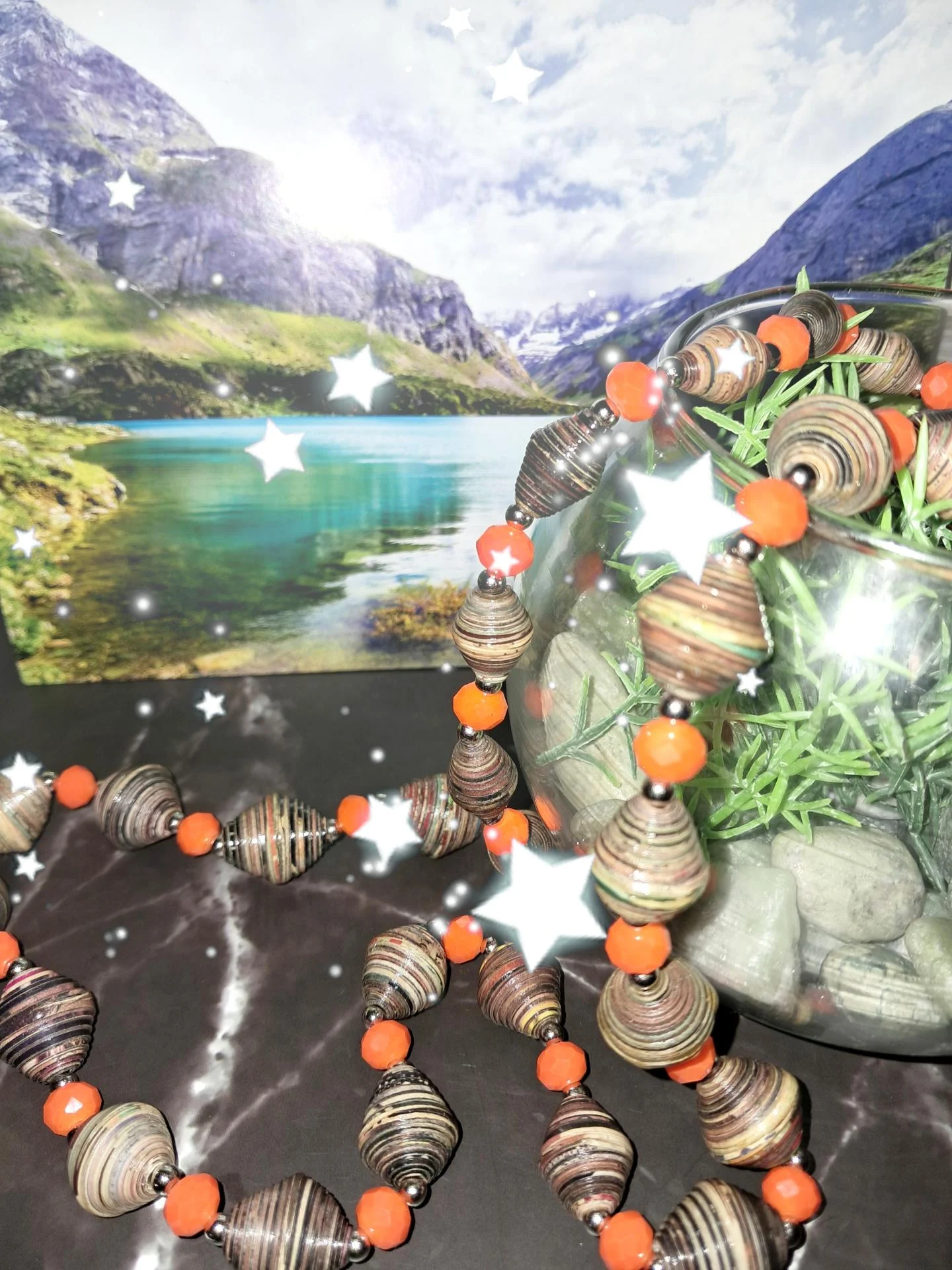 Collier ethnique orange et marron - perles en acier inoxydanle argenté