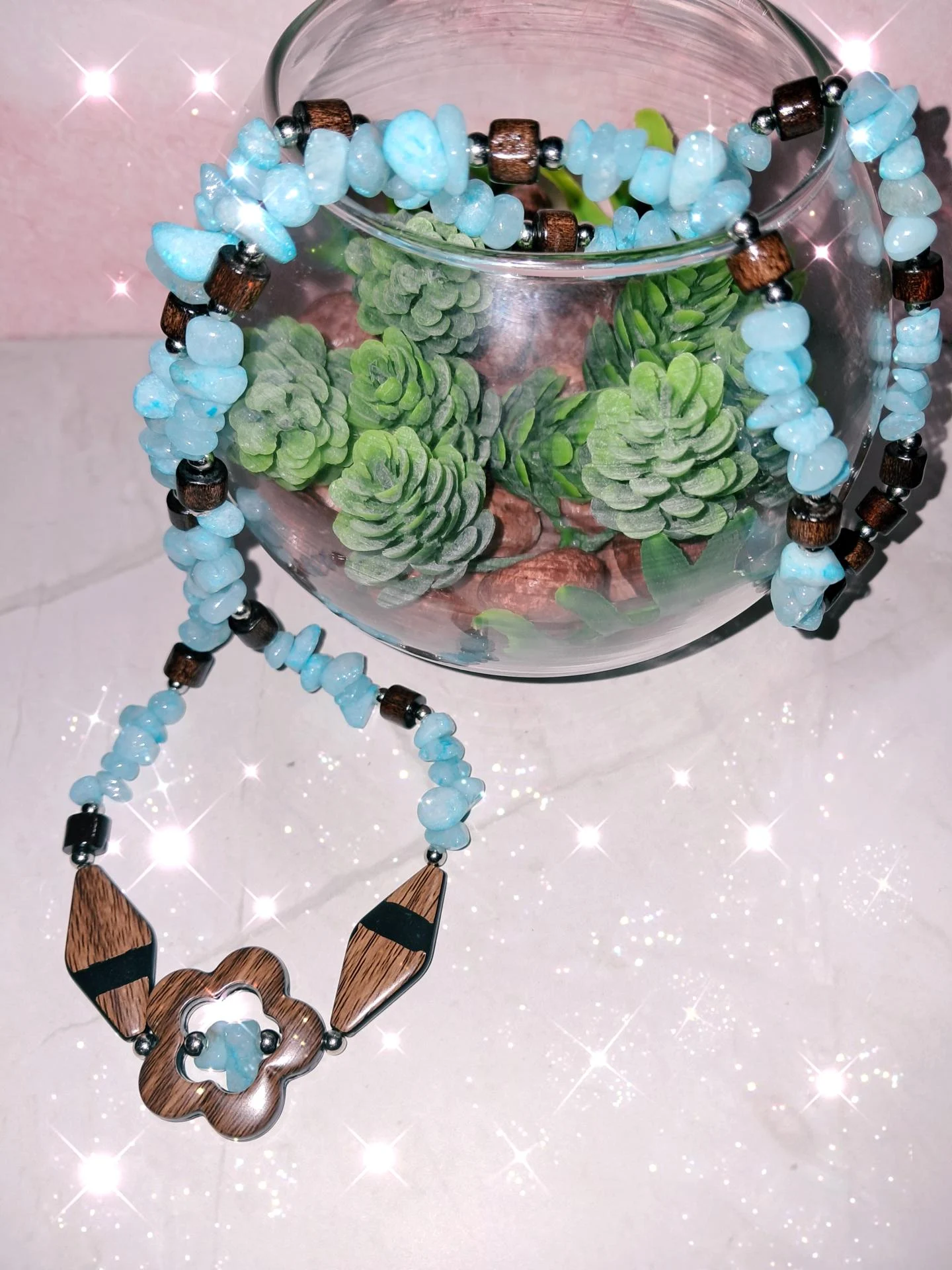 Collier fleur célèste-perles bleu ciel,bois brun et élément imitation bois acrylique