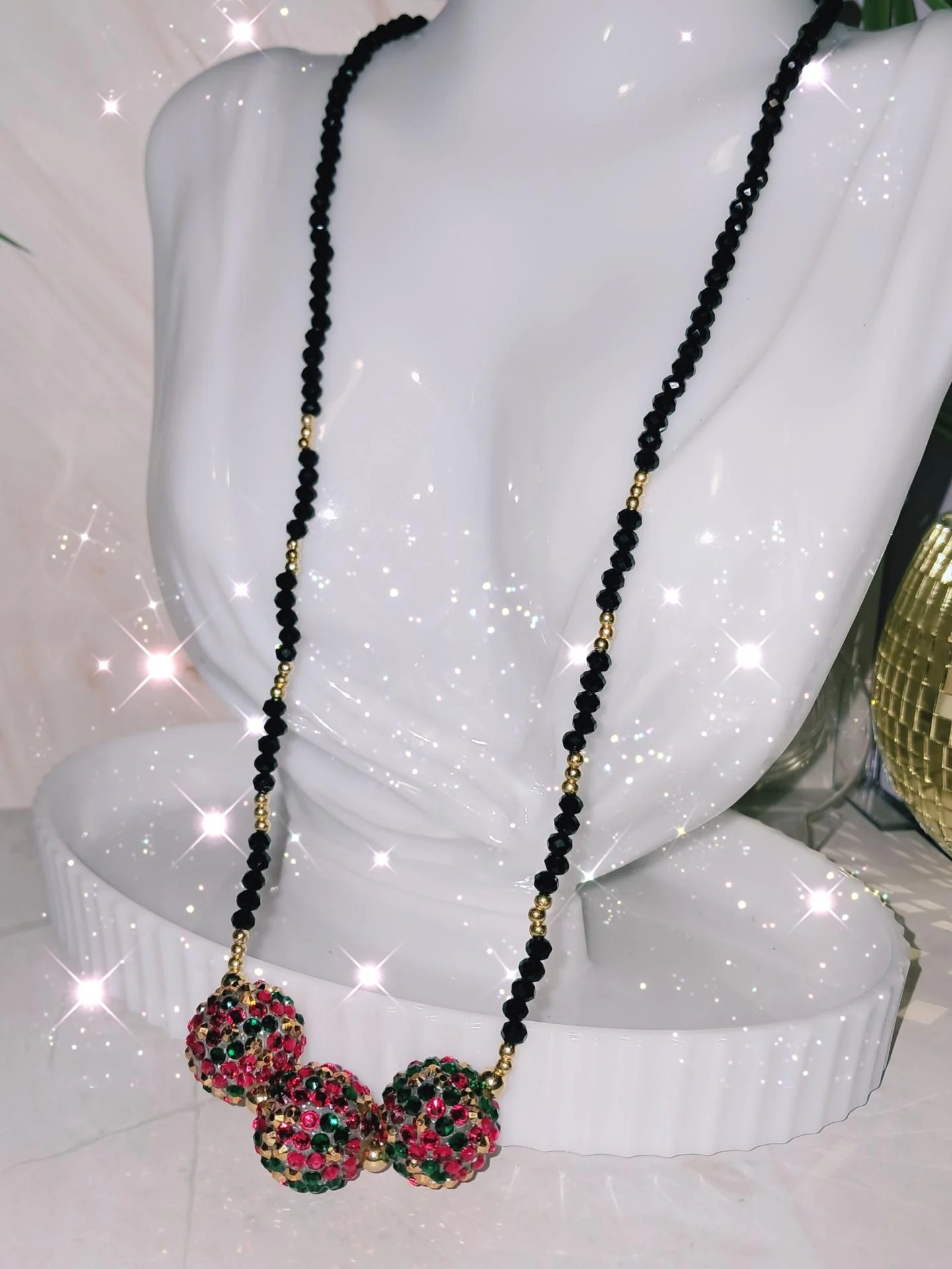 Un collier ultra chic et audacieux ,composé de perles facettées noires en verre,des perles dorées élégantes en acrylique et de trois grosses perles centrales en résine ornées de strass multicolores. Une création lumineuse ,glamour et irrésistible.