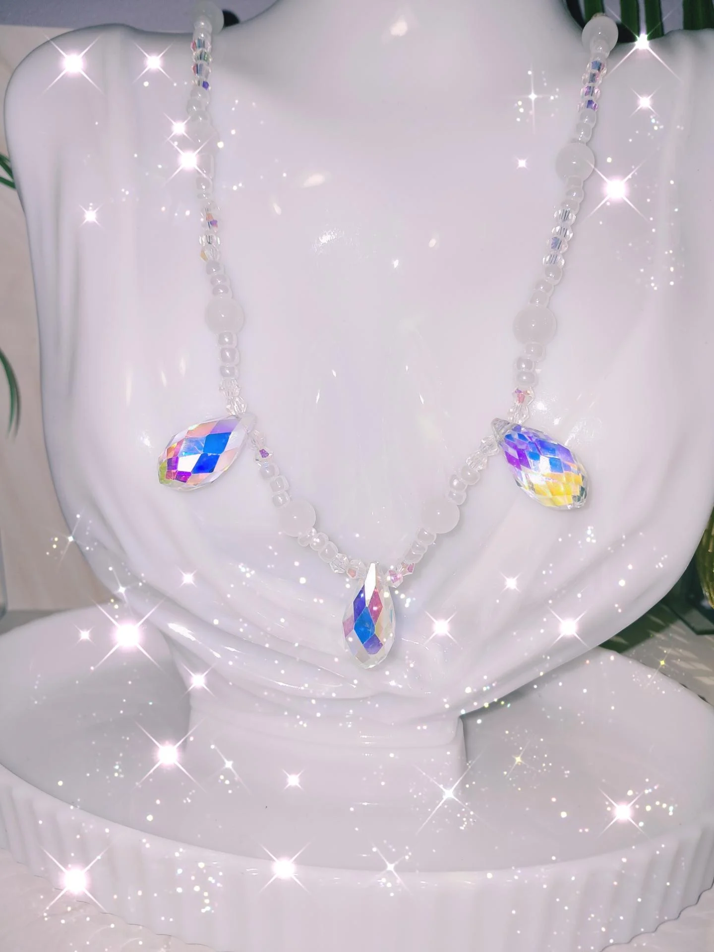 Collier délicat aux perles transparentes et iridescentes ,orné de trois pendentifs cristal arc en ciel .Une création lumineuse et élégante,symbole de pureté ,d'harmonie et d'énergie positive.