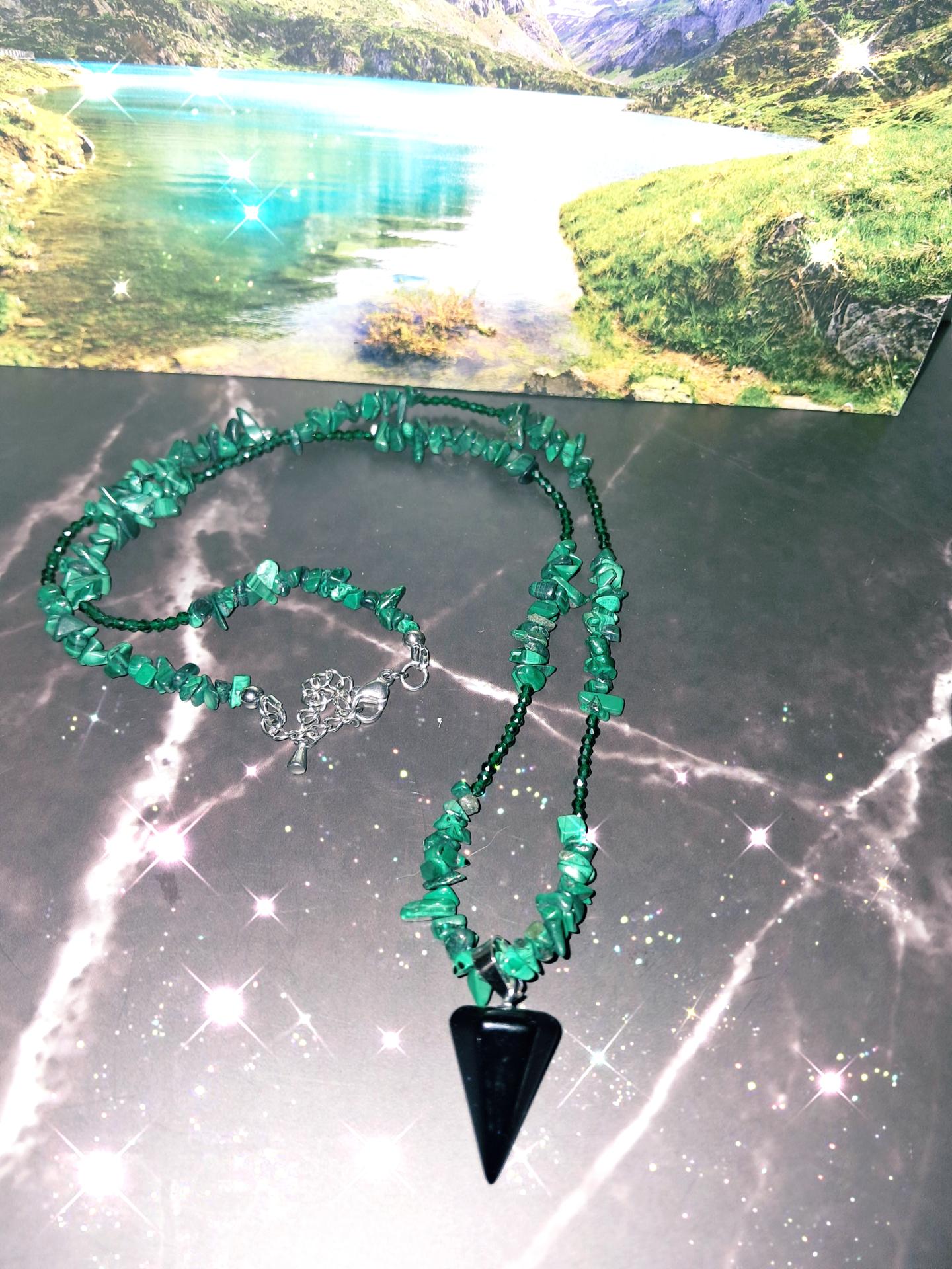 Collier élégant en pierre de Malachite de Spinelle verte, et Obsidienne noire. la combinaison de ses pierres apportent et multiplient les bienfaits.