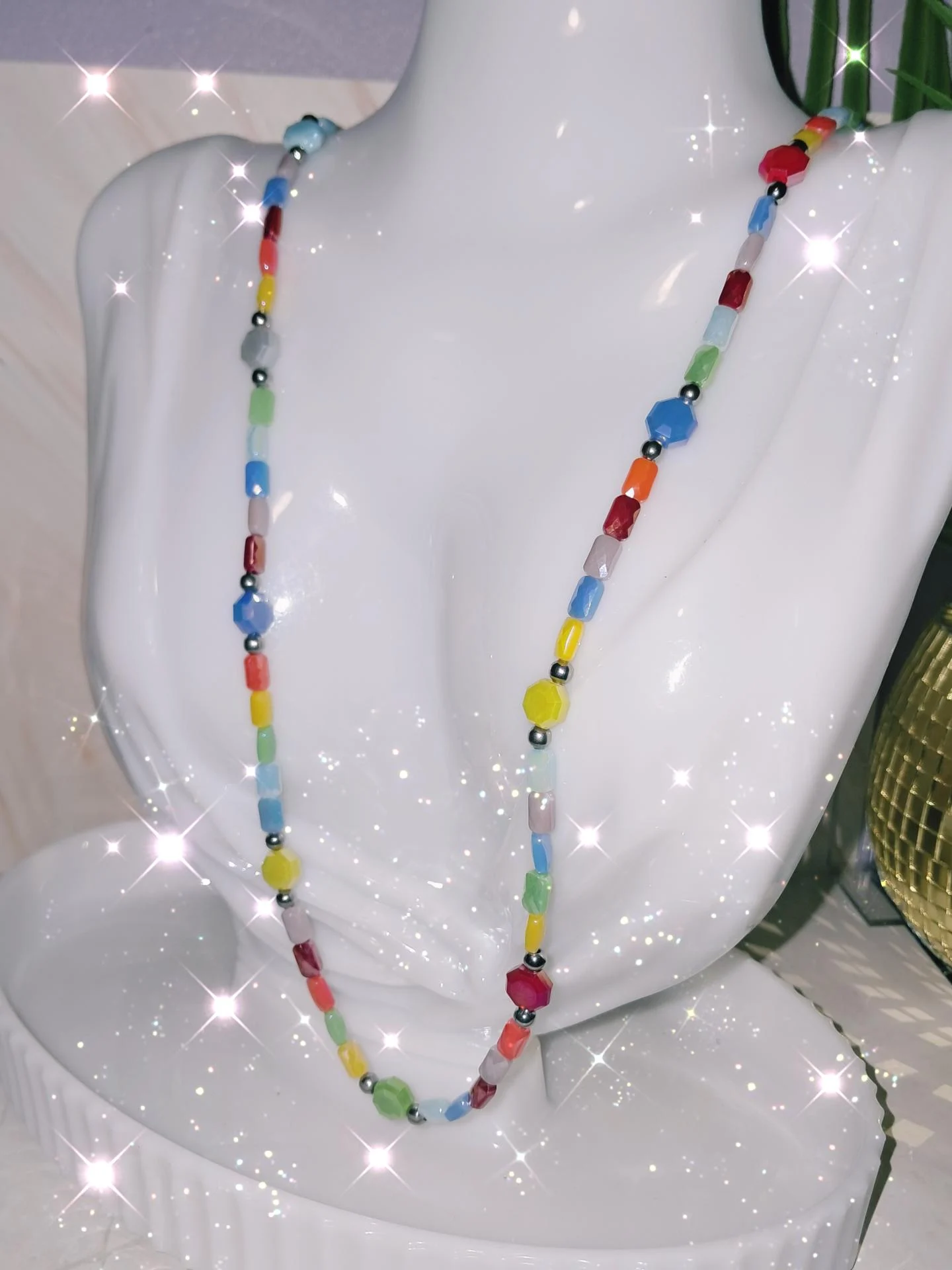 Collier fait main aux nuances multicolores,lumineux et harmonieux, rehaussé de perles octogonales séparées par l 'acier inoxydable argenté .Une pièce joyeuse et élégante , pleine de fraîcheur.