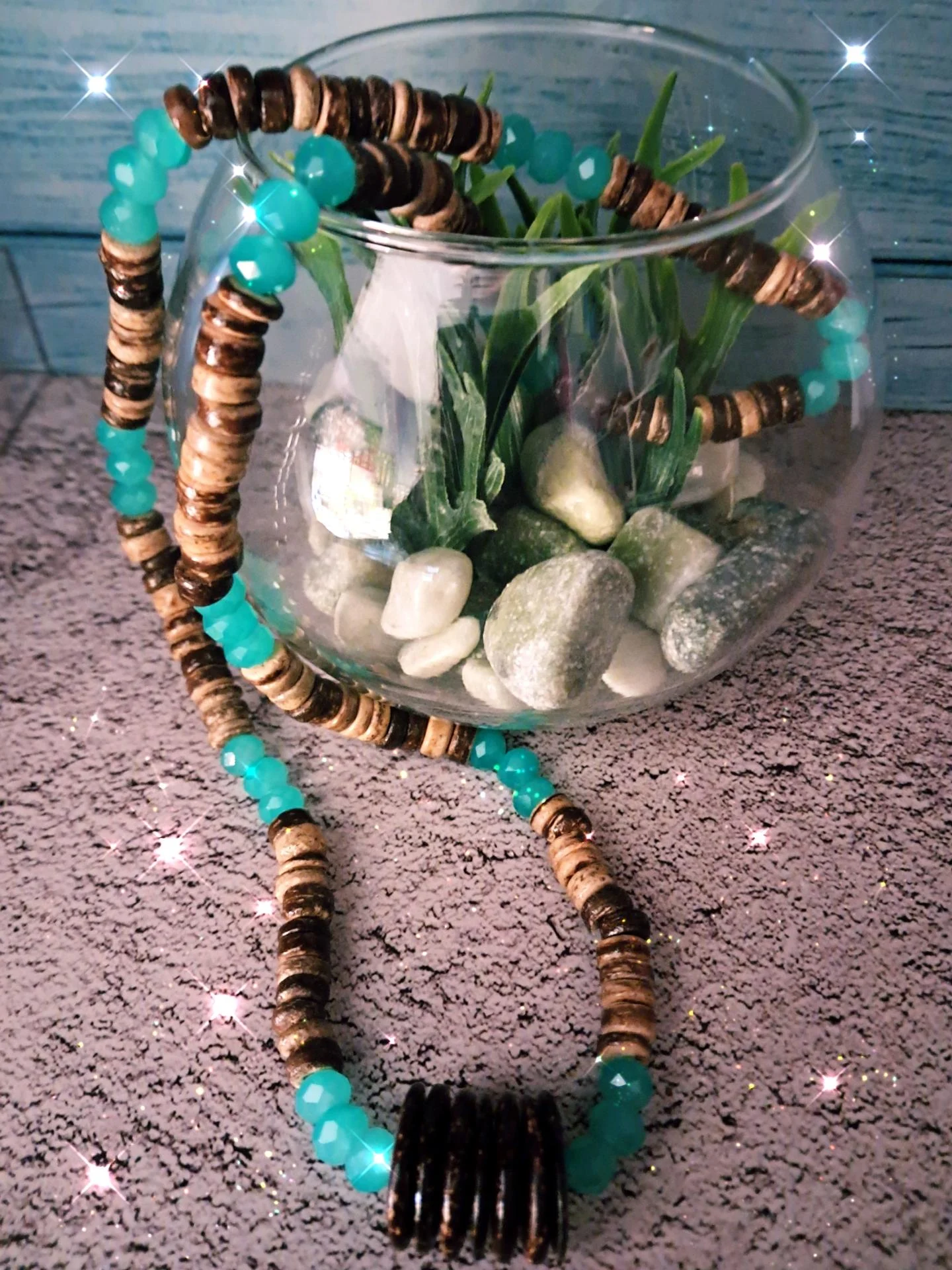 Un collier artisanal au charme naturel,mélant le bois de coco verni & des perles en verre facetté turquoise.Une création unique,symbole d'équilibre entre terre et mer.