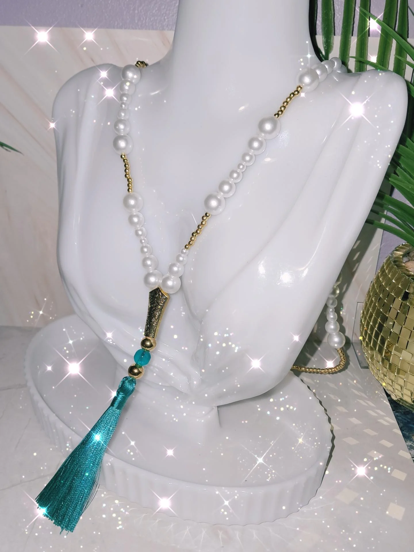 création unique fait main collier élégant collier chic frange verte perles blanches et dorées collier en acrylique