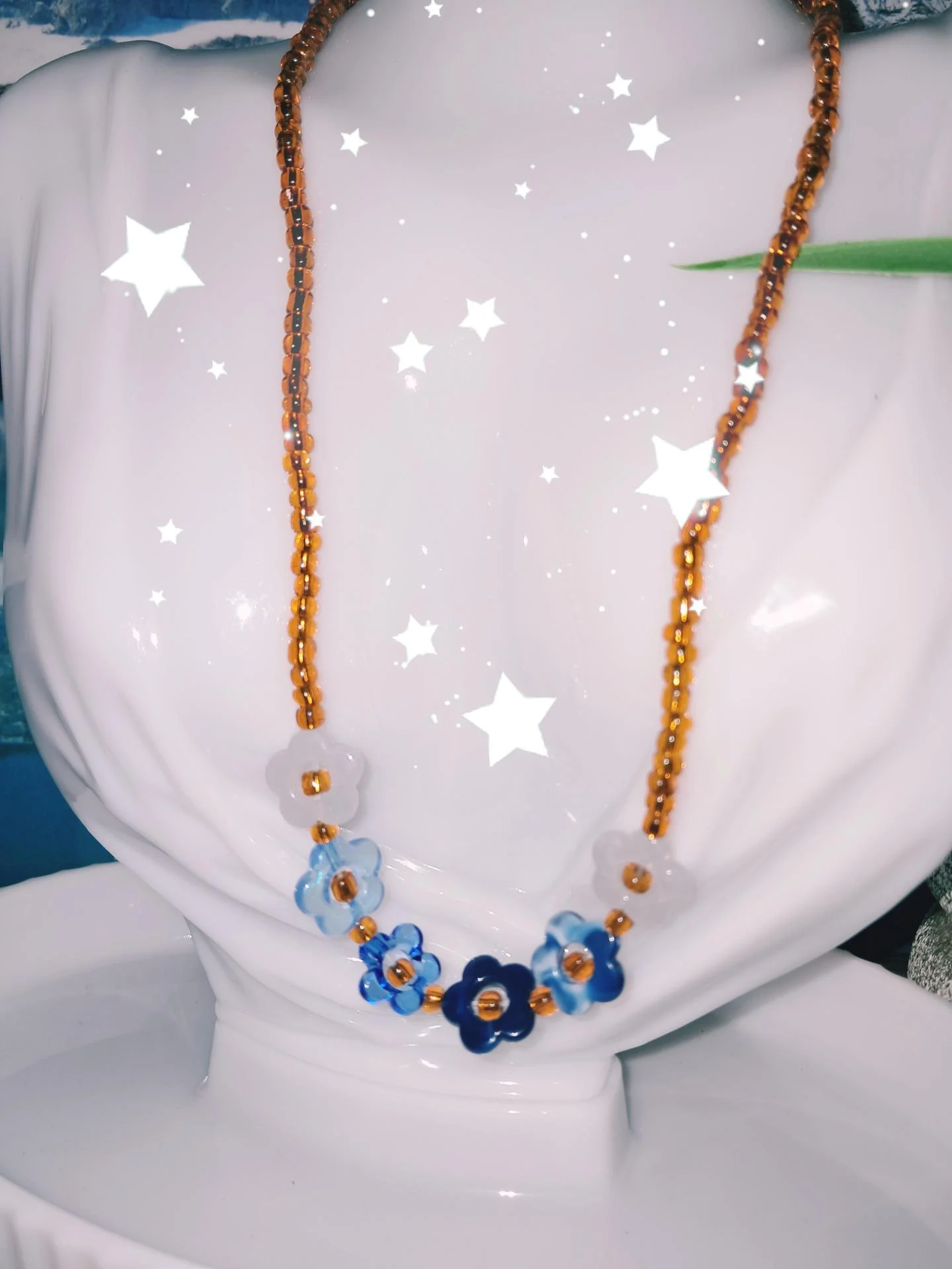 Un collier court extensible, lumineux et délicat ,ou l'orange éclatant des perles de rocaille rencontre la douceur des fleurs en acrylique aux 4 tons de bleu et blanc.Un bijou qui apporte chaleur ,fraîcheur et gaieté à toutes vos tenues