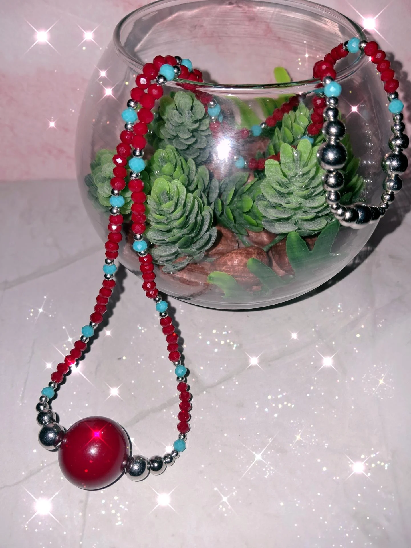 Un collier lumineux et élégant,composé de perles de verres facettées bordeaux et turquoise,sublimé par des perles en acier inoxydable argenté et une grosse perles centrale bordeaux en acrylique qui apporte toute la profondeur et la personnalité du bijou.