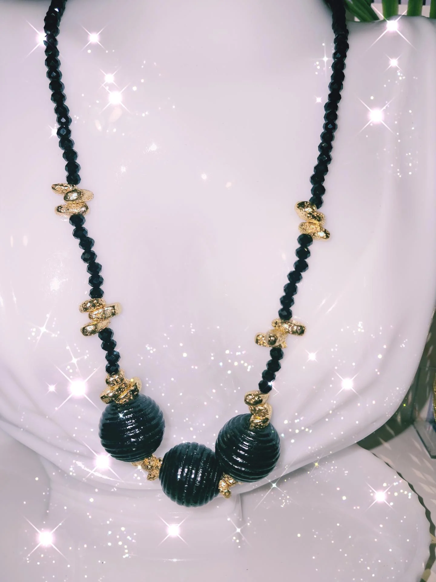 Collier raffiné en perles facettées noires et hématite dorée,sublimé par trois perles centrales sculptées, peint et vernis à la main.Une création élégante et lumineuse ,symbole de force ,de protection et de sophistication.