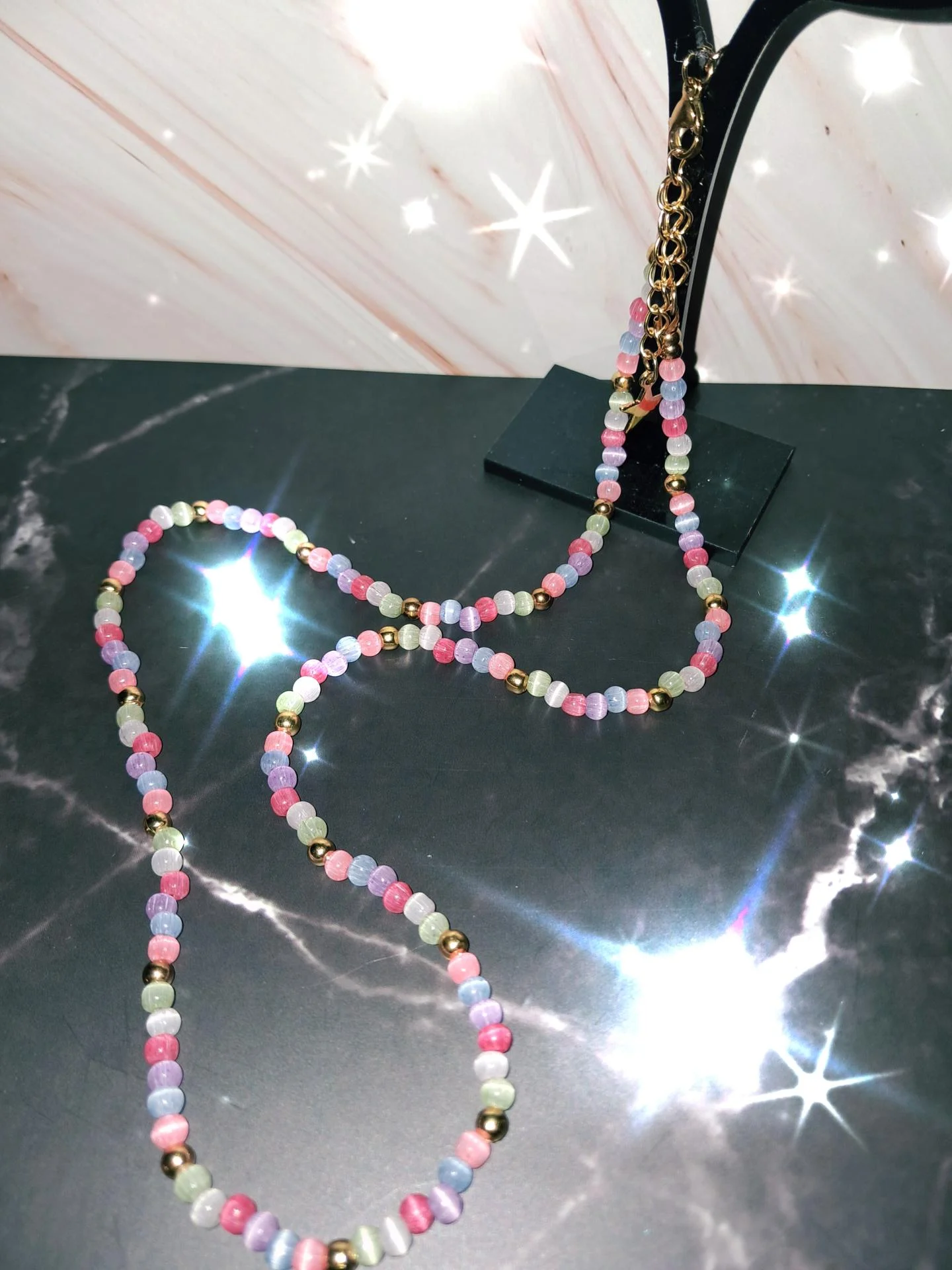 Collier réglable composé de perles oeil de chat de 4 mm multicolore et perles séparatrices en acier inoxydable dorées.Sublime collier élégant et discret.