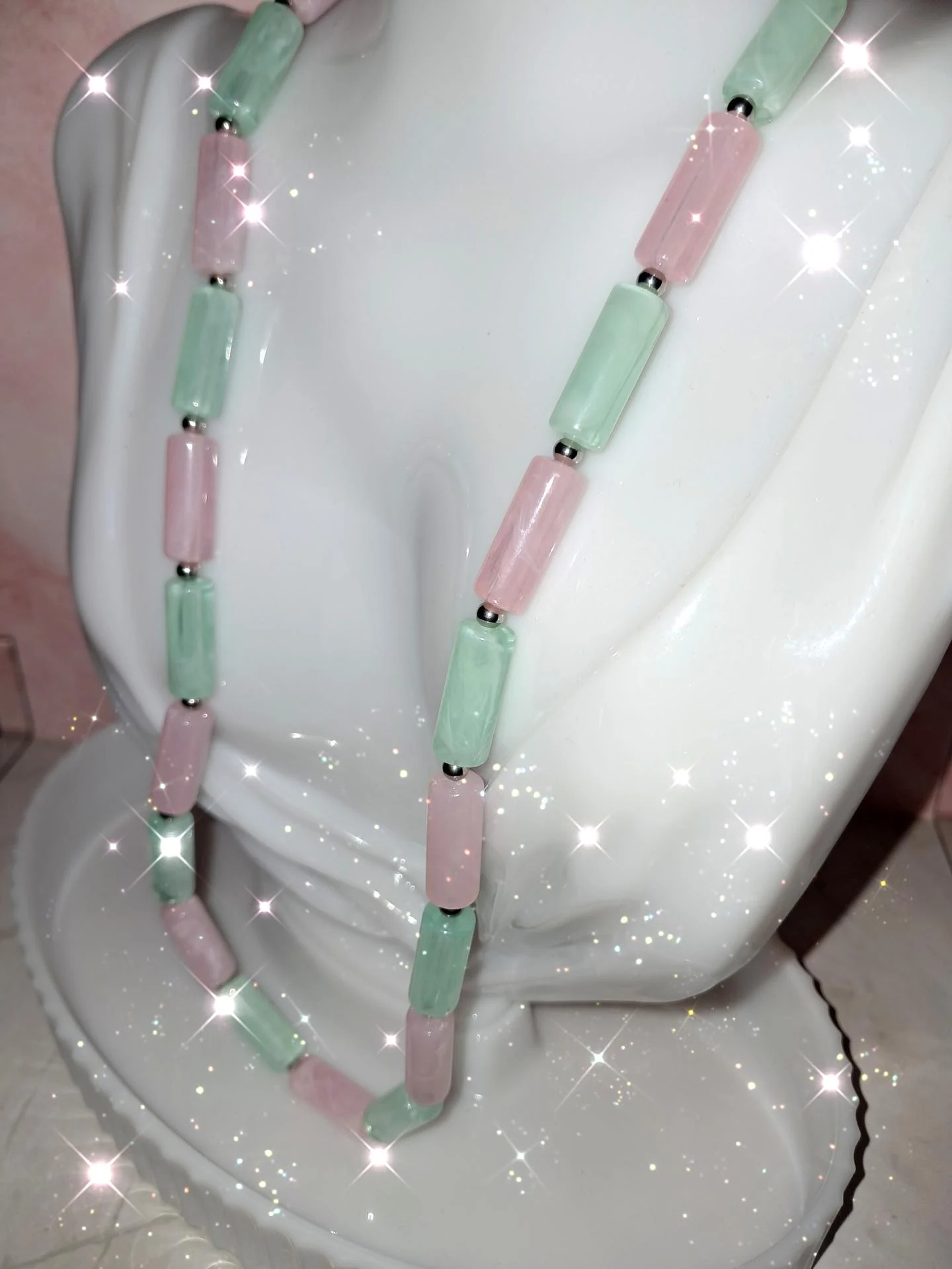 Collier réglable en acier inoxydable,composé de perles cylindriques rose tendre et vert d'eau à l'effet marbré.Un bijou frais ,doux et lumineux,idéal pour toutes les tenues.