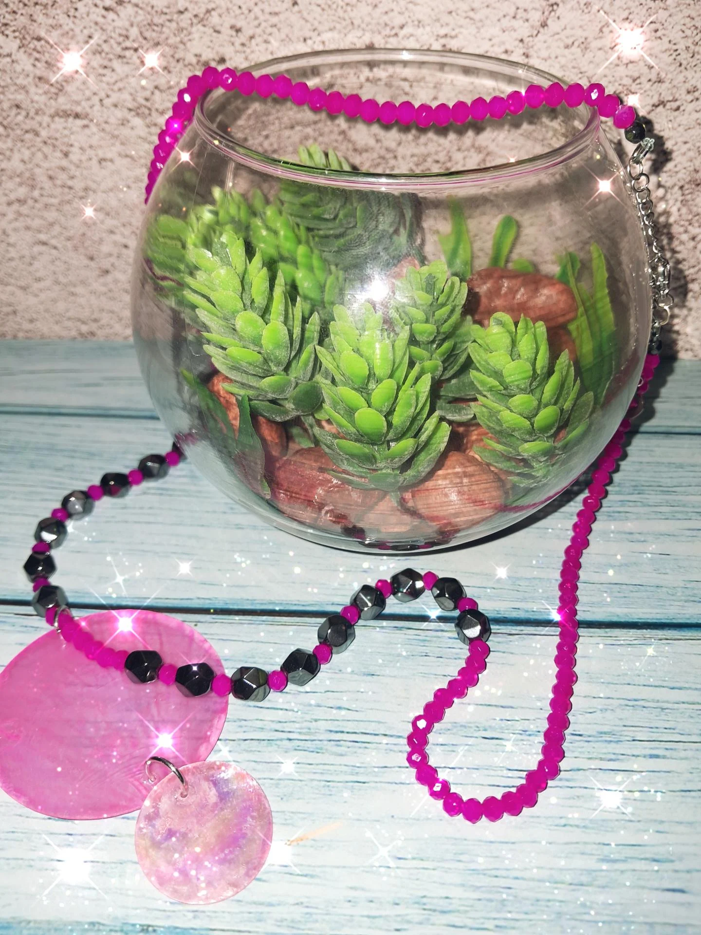 Elégant collier rose fuchsia,composé de perles de verre facetté et de perles d'hématite noire. Son grand pendentif imitation nacre rose,capte la lumière avec délicatesse,ajoutant une touche glamour et féminine à votre tenue.