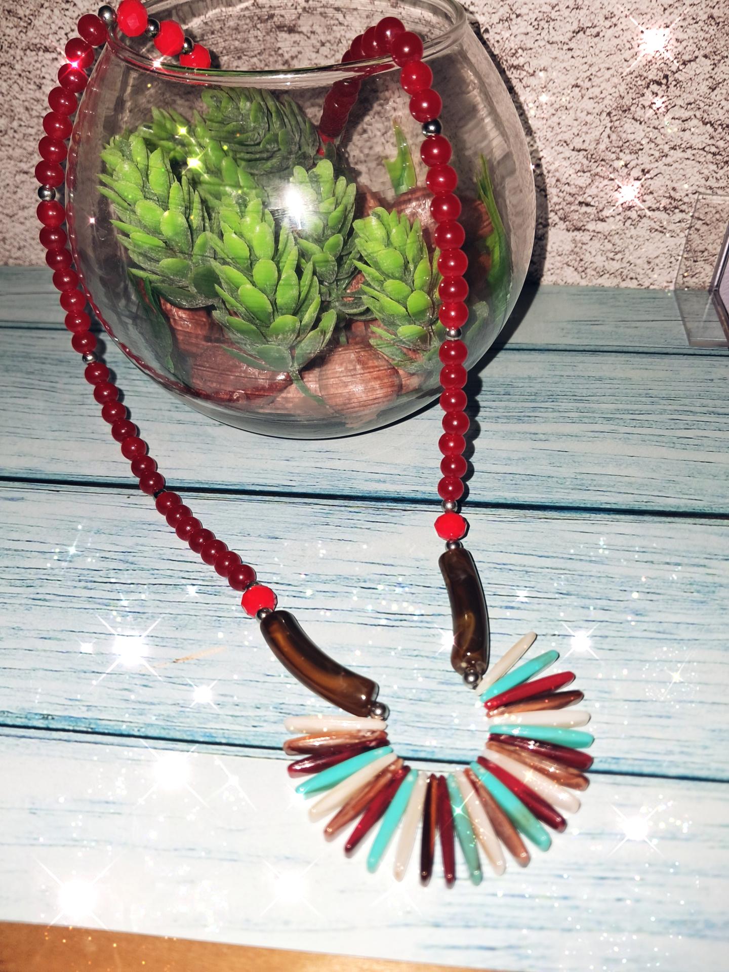 Un collier éclatant aux tons chauds & lumineux,mélant perles de verre rouges ,accents marron & pendentif multicolore original.Pièce artisanale unique,pleine de vitalité et de style bohème.