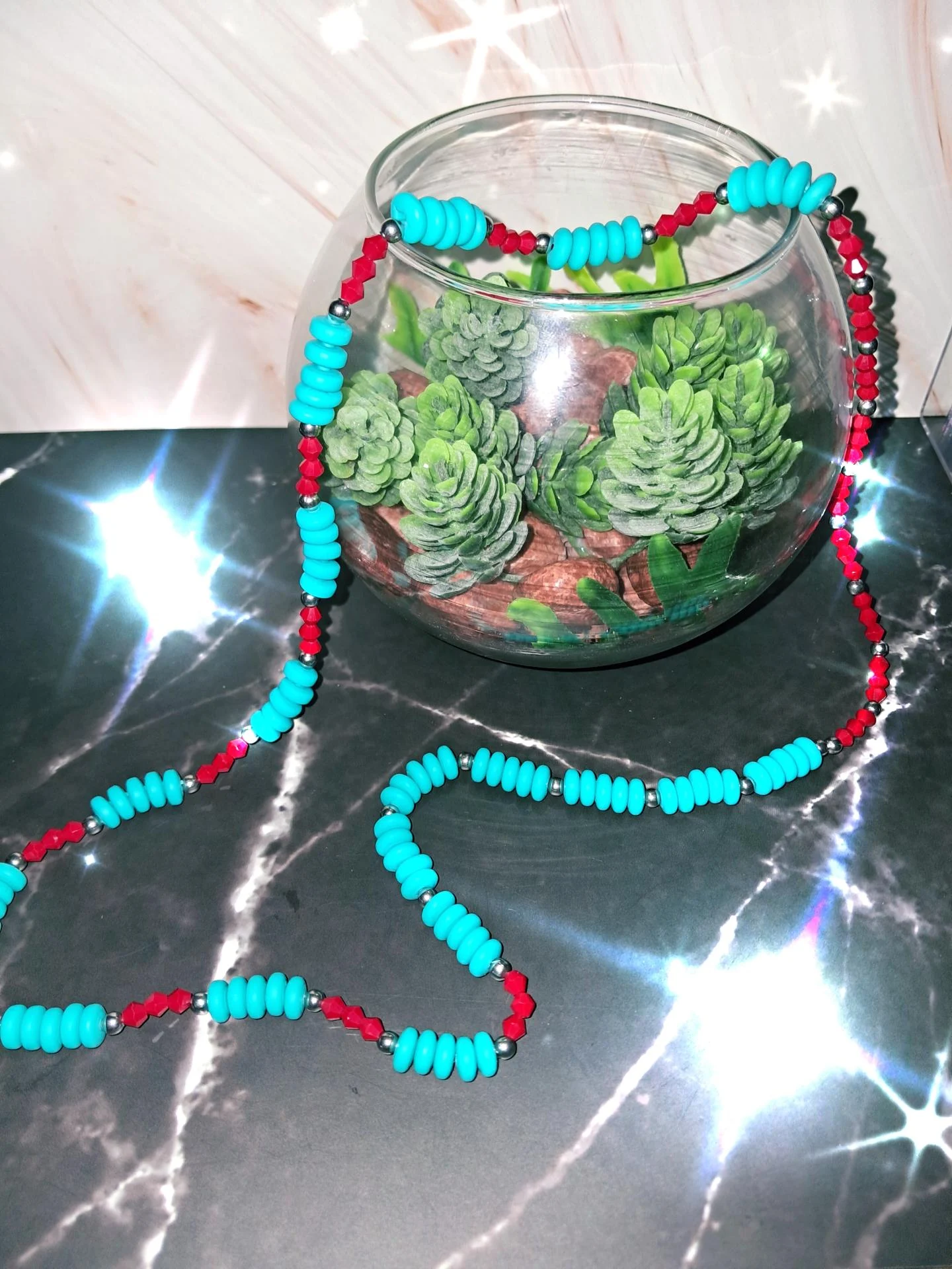 Collier coloré et moderne composé de perles turquoise en argile polymère de haute qualité,de petites perles rouge en verre facetté et d'intercalaires en acier inoxydable argenté.Un bijou léger ,vif et durable.