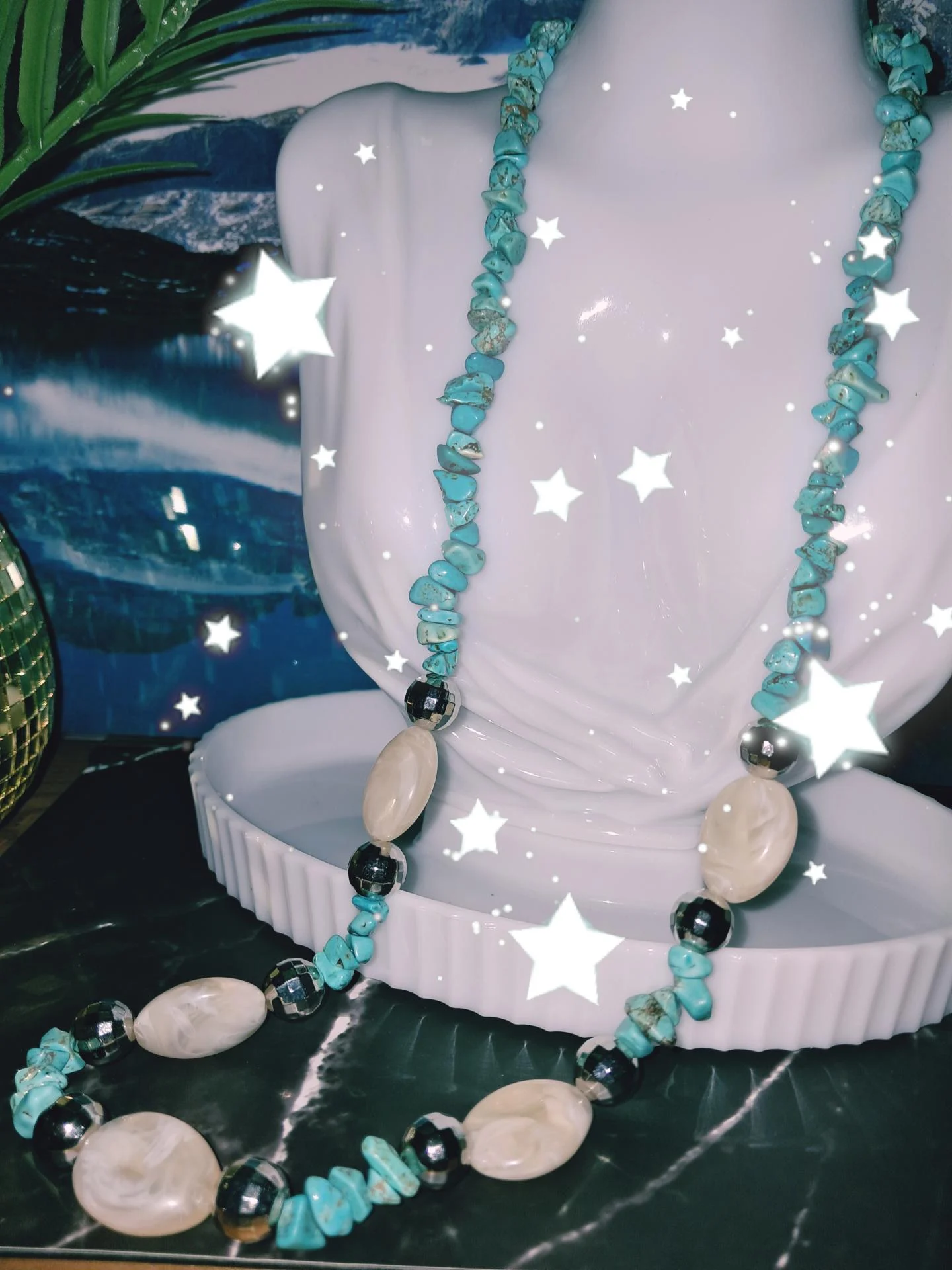 Collier fait main en pierre de turquoise naturelle,perles ovales champagne et perles argentées boules à facettes.Une création lumineuse aux accents bohèmes et élégants.