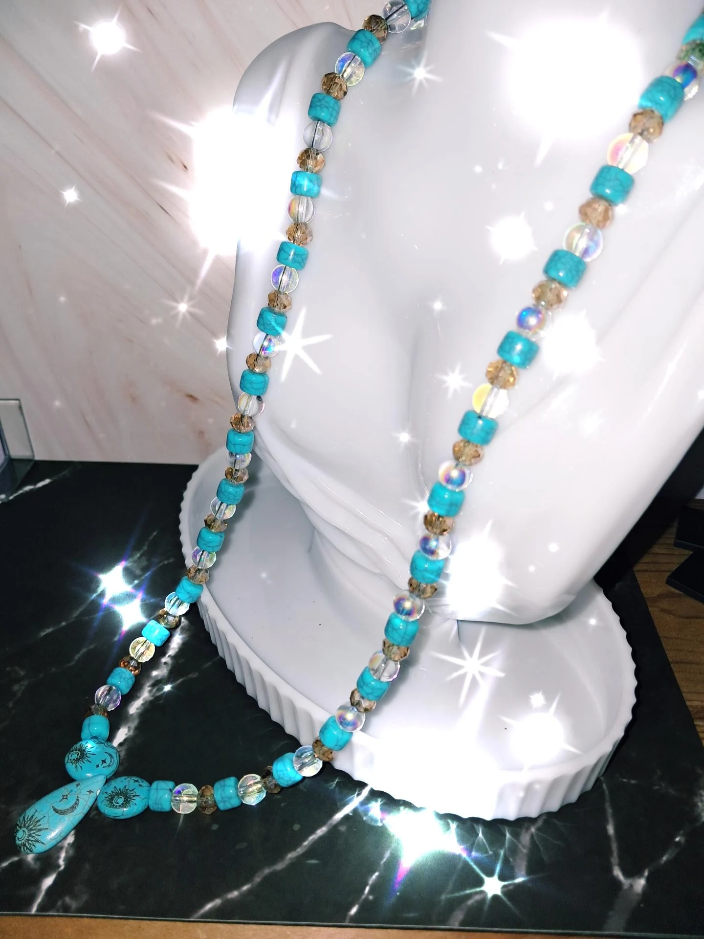 Collier turquoise lumineux et cristal champagne-pendentif soleil ,lune étoile