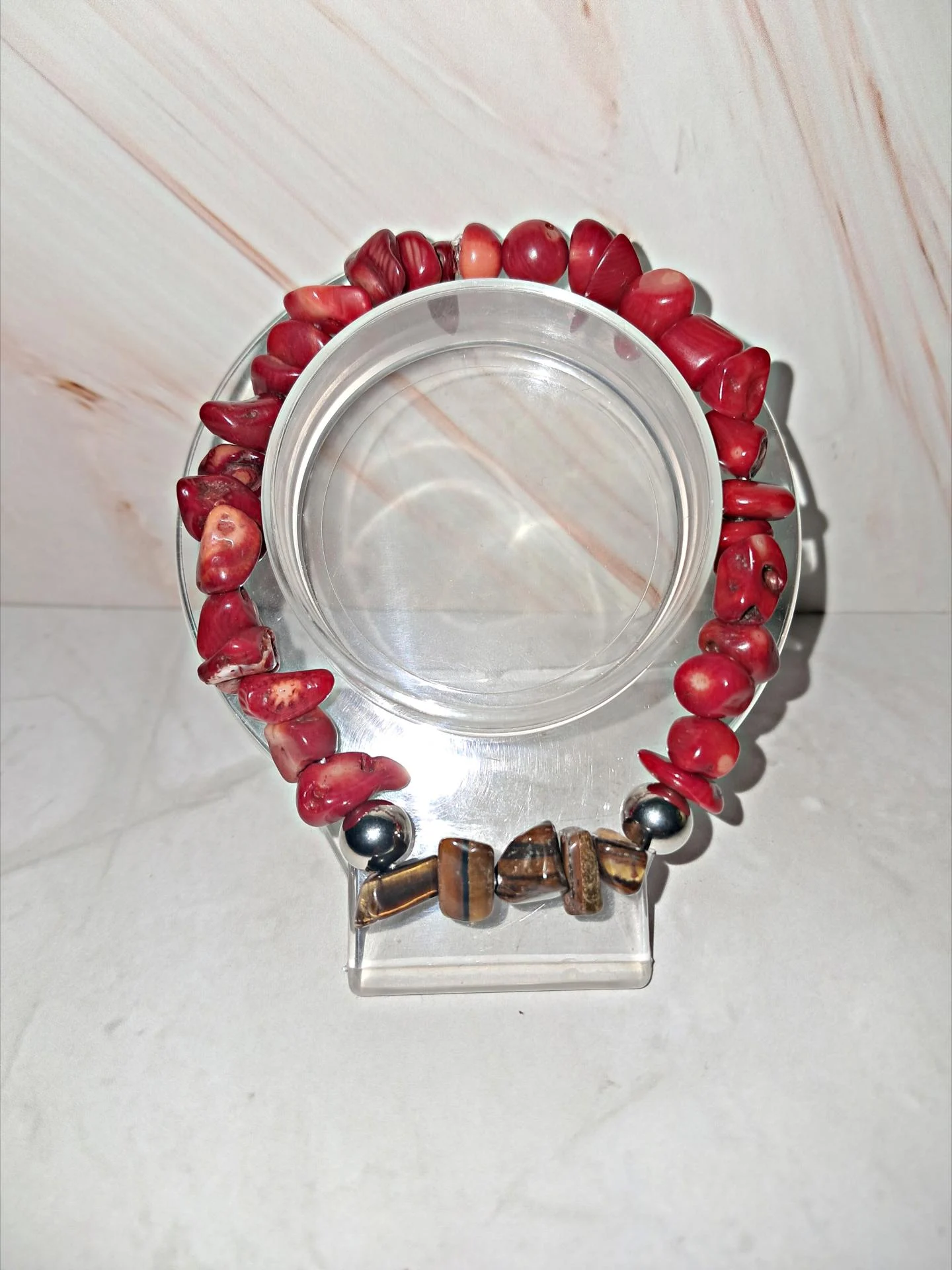 Bracelet extensible pour homme en perles irrégulières d'oeil de tigre ,sublimé par des pierres de corail rouge et deux intercalaires en acier inoxydable argenté. Un bijou puissant et élégant.