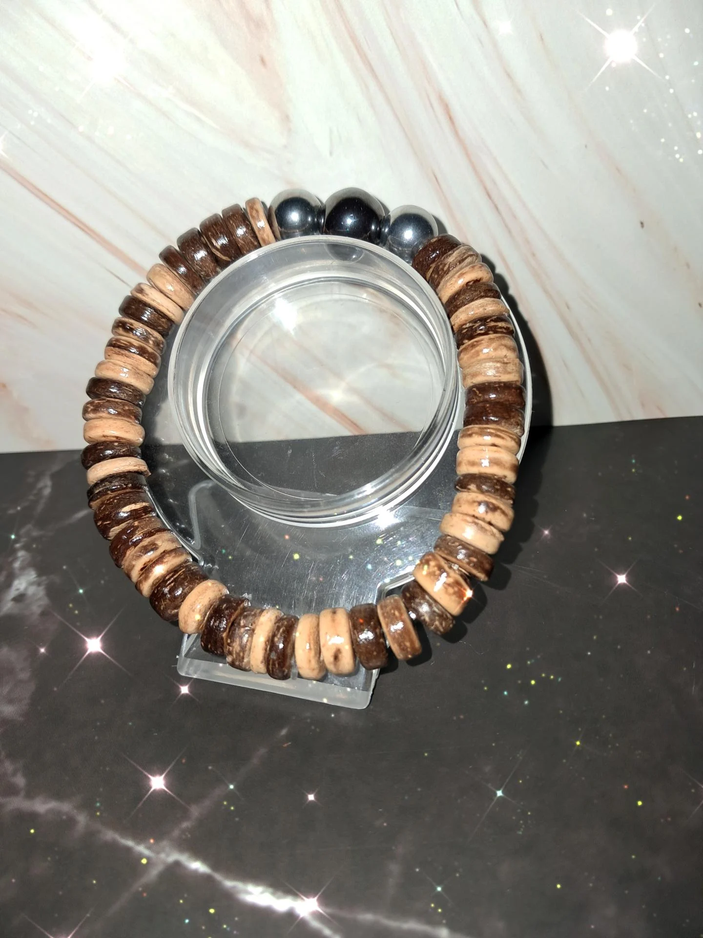 Bracelet extensible homme ,perles en bois de coco verni par moi-même ,en son centre ,trois grosses perles en hématite noire et argenté.
