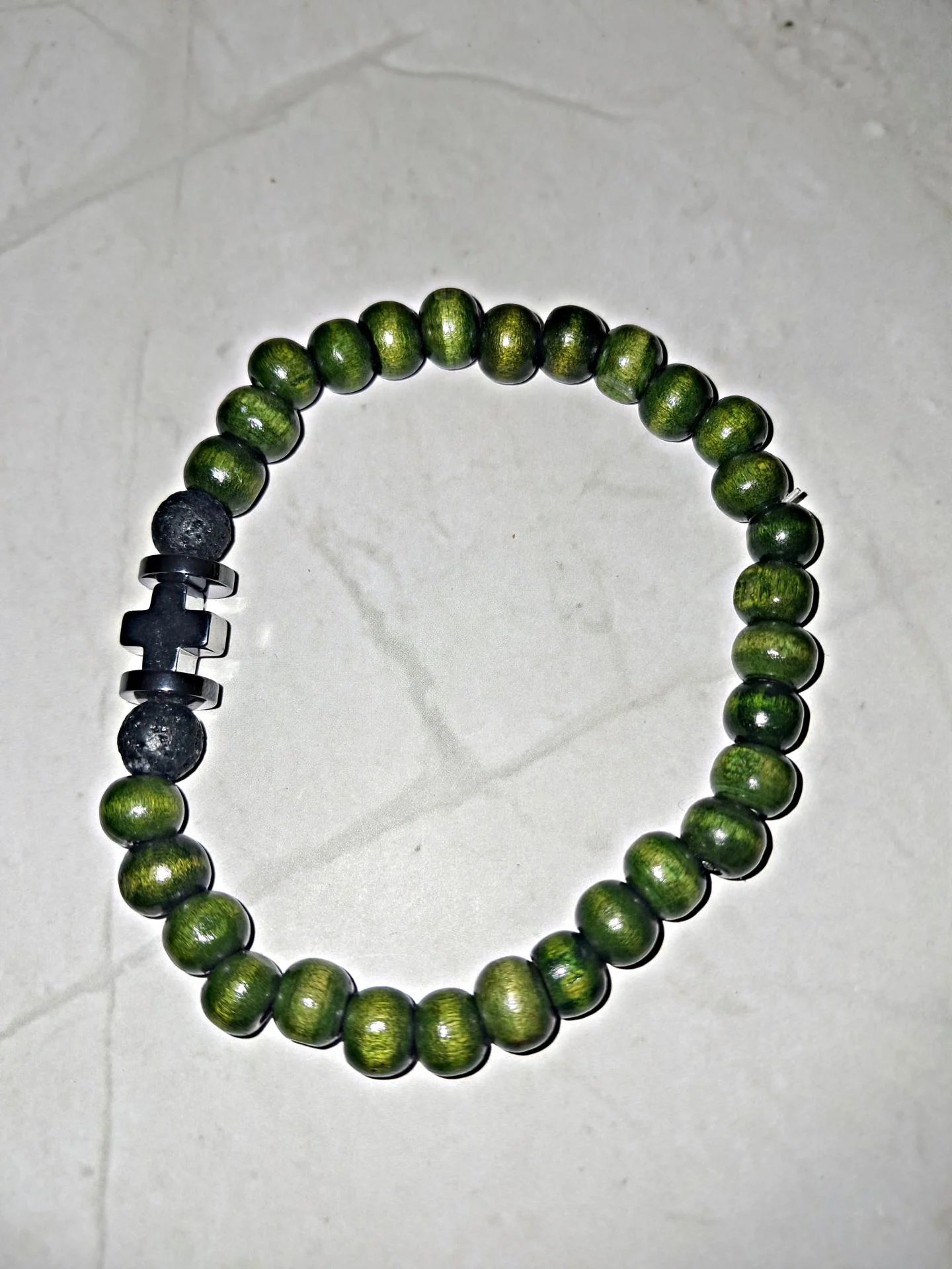 Bracelet homme,perles en bois de couleur vert,assortie de deux perles plates et croix en hématite noire.