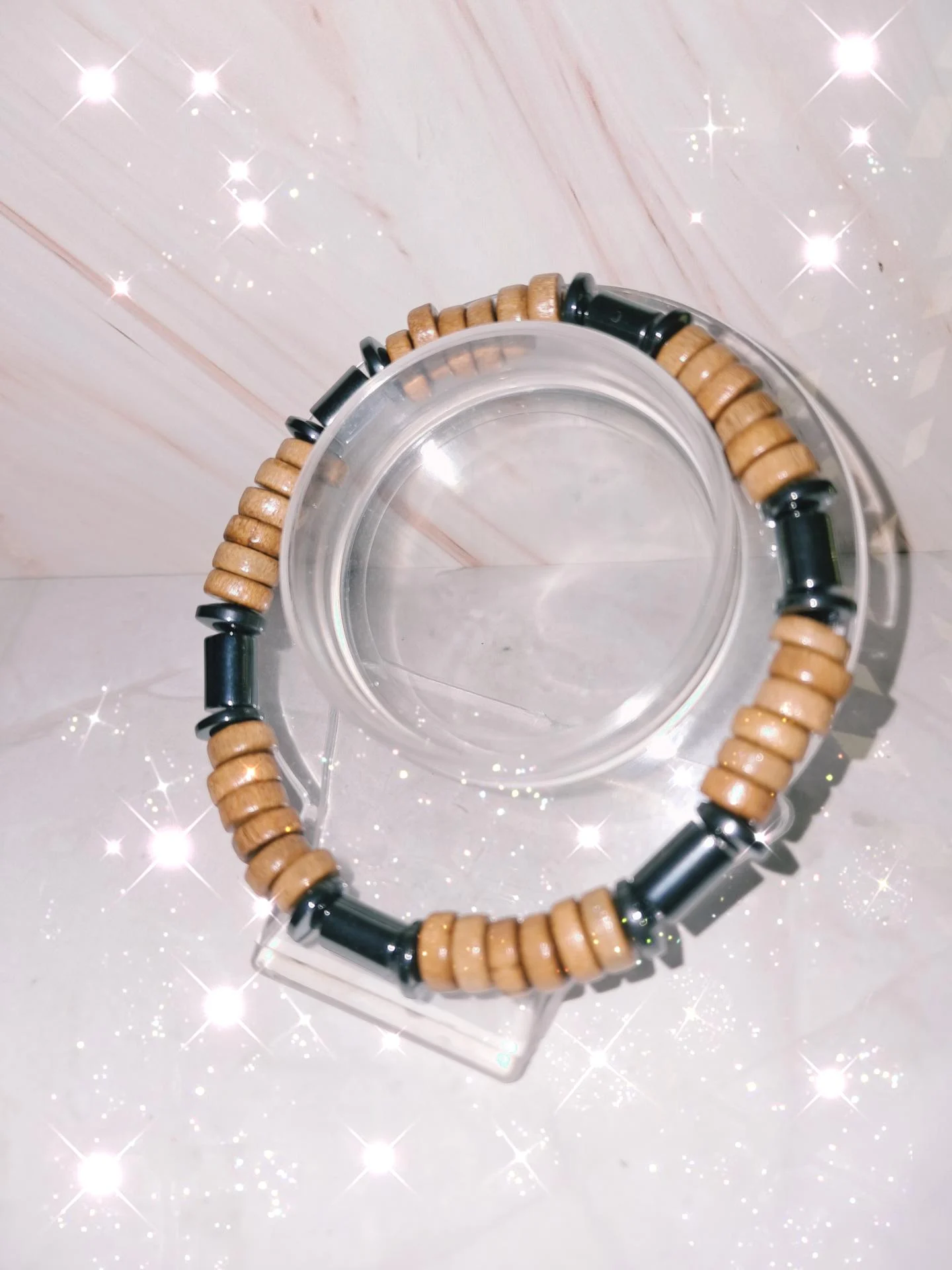 Bracelet extensible homme, en bois clair et vernis accompagné de perles en hématite noire plates et cylindriques. bijou chic, bracelet tendance, bracelet intemporel,bracelet incontournable.