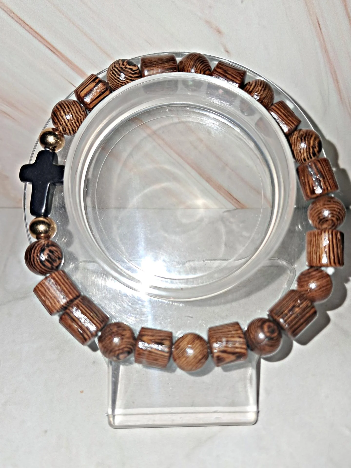 Bracelet extensible pour homme en perles de bois ,formes cylindriques et rondes ,orné d'une croix en pierre noire entouré de perles en acier inoxydable doré.
