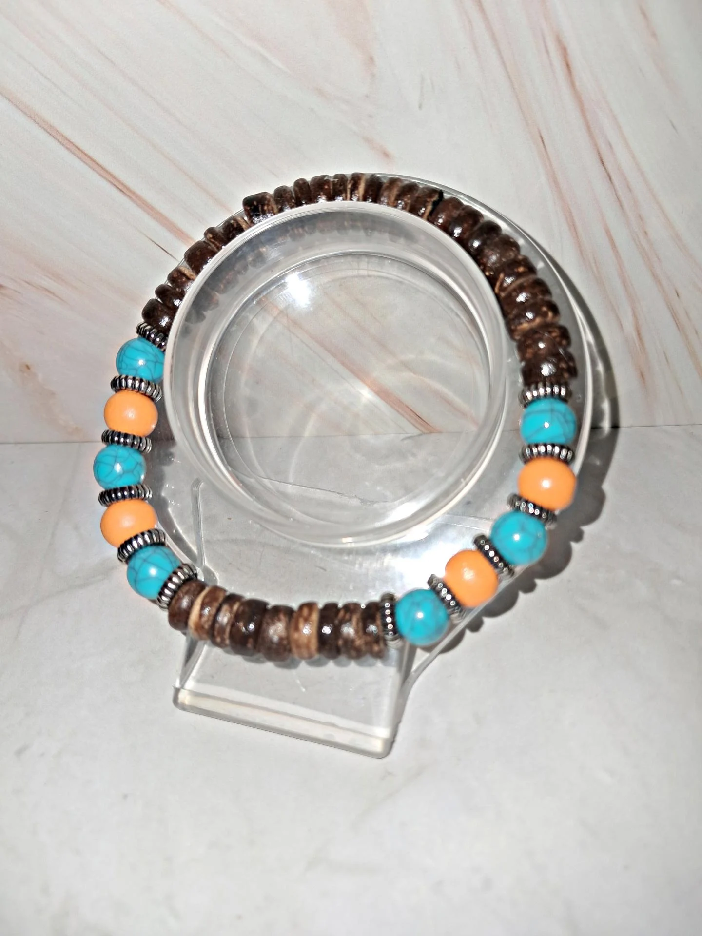 Bracelet homme extensible ,perles en bois de coco vernis ,perles orange en bois classique ,perles turquoise et perles d'intercalaires argentées en acrylique.
