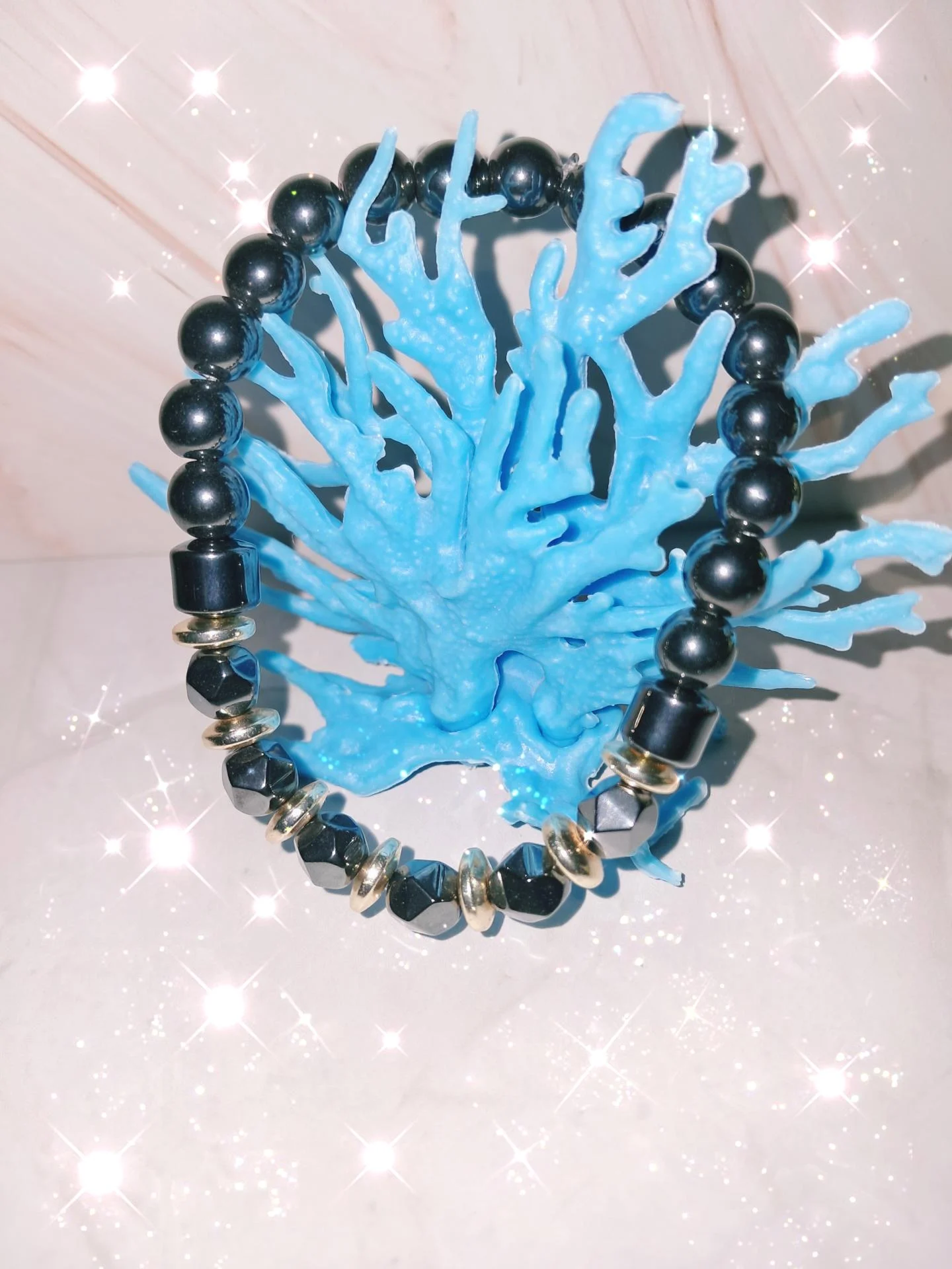 Bracelet extensible tout en hématite noire et doré. Perles de plusieurs formes : rondes ,plates ,octogonales ,cylindriques. Un bracelet qui attire le regard & sublimera votre poignet Style moderne et masculin.