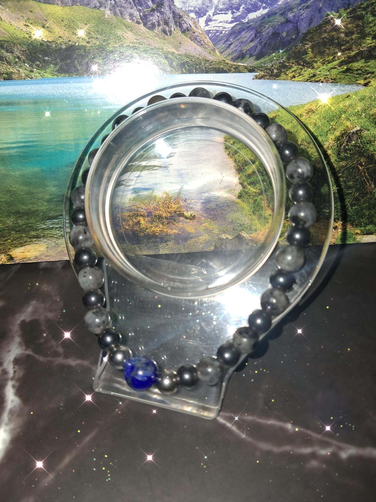 Bracelet extensible et unique. Ce bracelet est composé de pierre de Labradorite de deux perles en acier inoxydable et en son centre le Lapis Lazuli. Bijou de haute qualité et une bonne tenue au poignet. Se porte quotidiennement . Evitez les produits chimiques .
