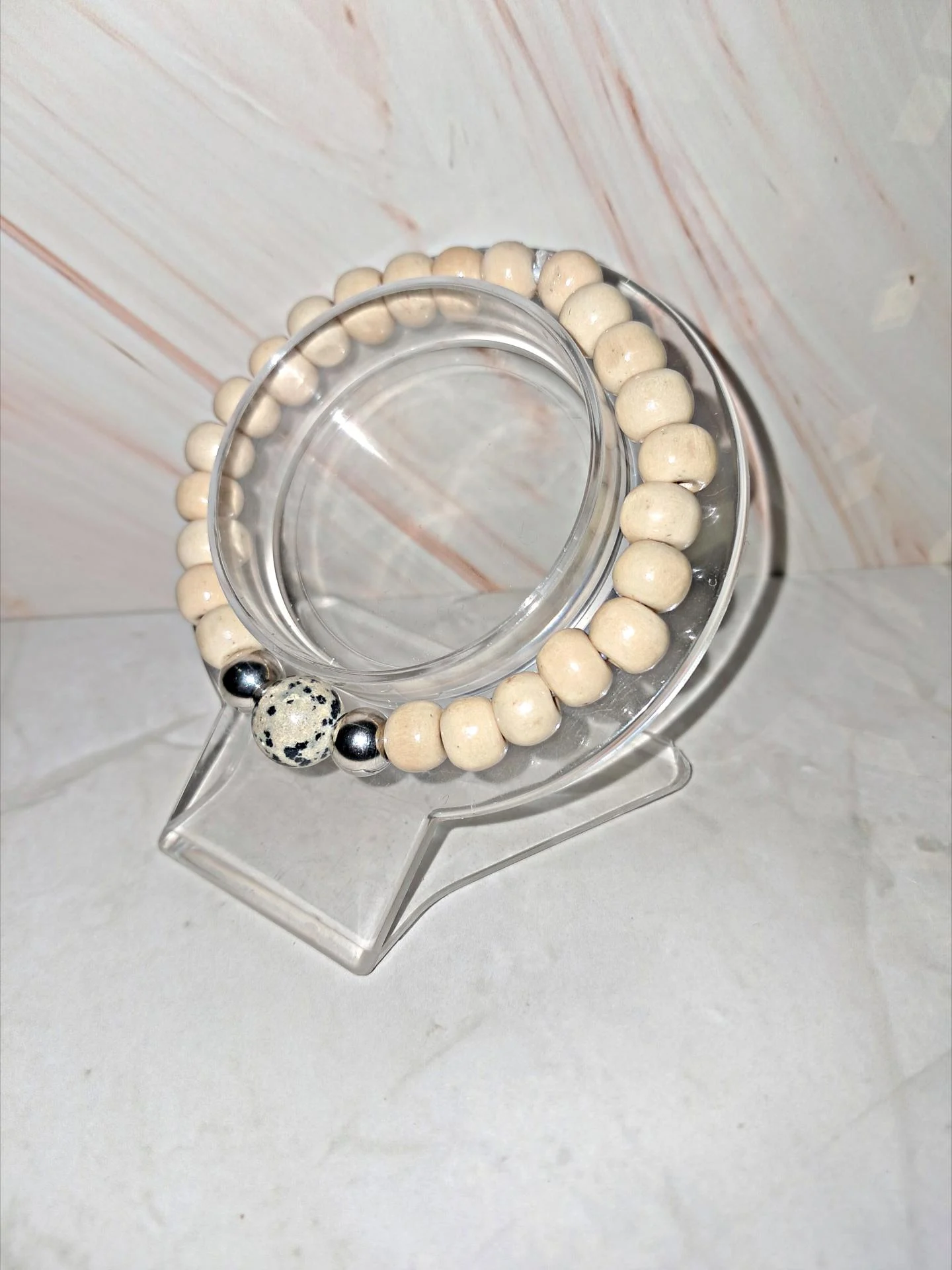 Bracelet masculin en perles de bois beige,sublimé par une pierre imitation jaspe et des finitions argentées. Un bijou naturel et moderne