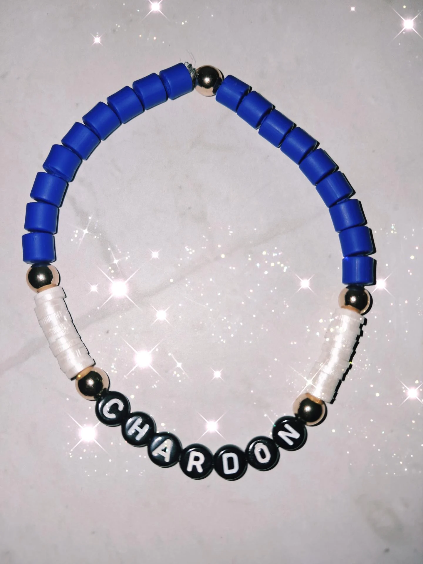 Affiche ton soutien à l'Ecosse avec ce bracelet Chardon aux couleurs bleu & blanc,sublimé par des perles d'espacement dorées en hématite. Un bijou sportif,élégant et fait main,parfait pour les passionnés de rugby Bracelet extensible -T M/L