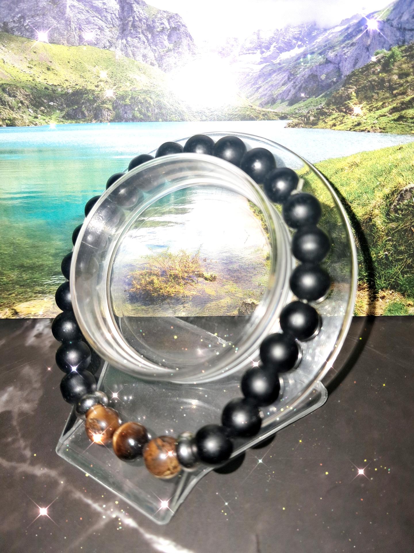 Bracelet homme en perle de verre noir opaque ,perles centrales en acier inoxydable et en pierre d'oeil de tigre