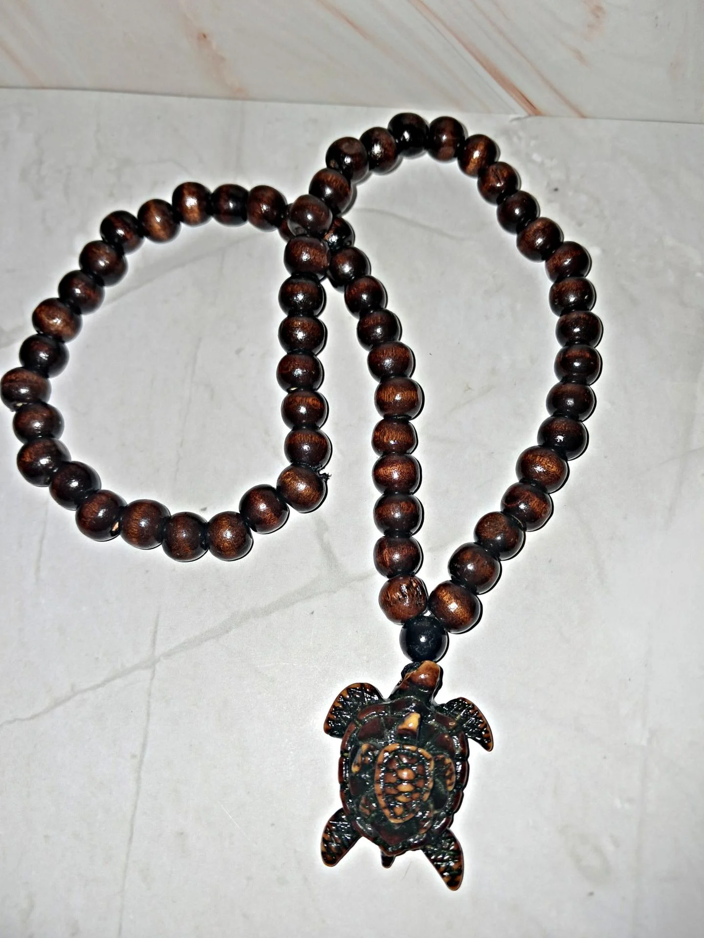 Collier masculin en perles de bois sombre,orné d'un pendentif tortue avec son bébé en résine.Un bijou symbolique et naturel.