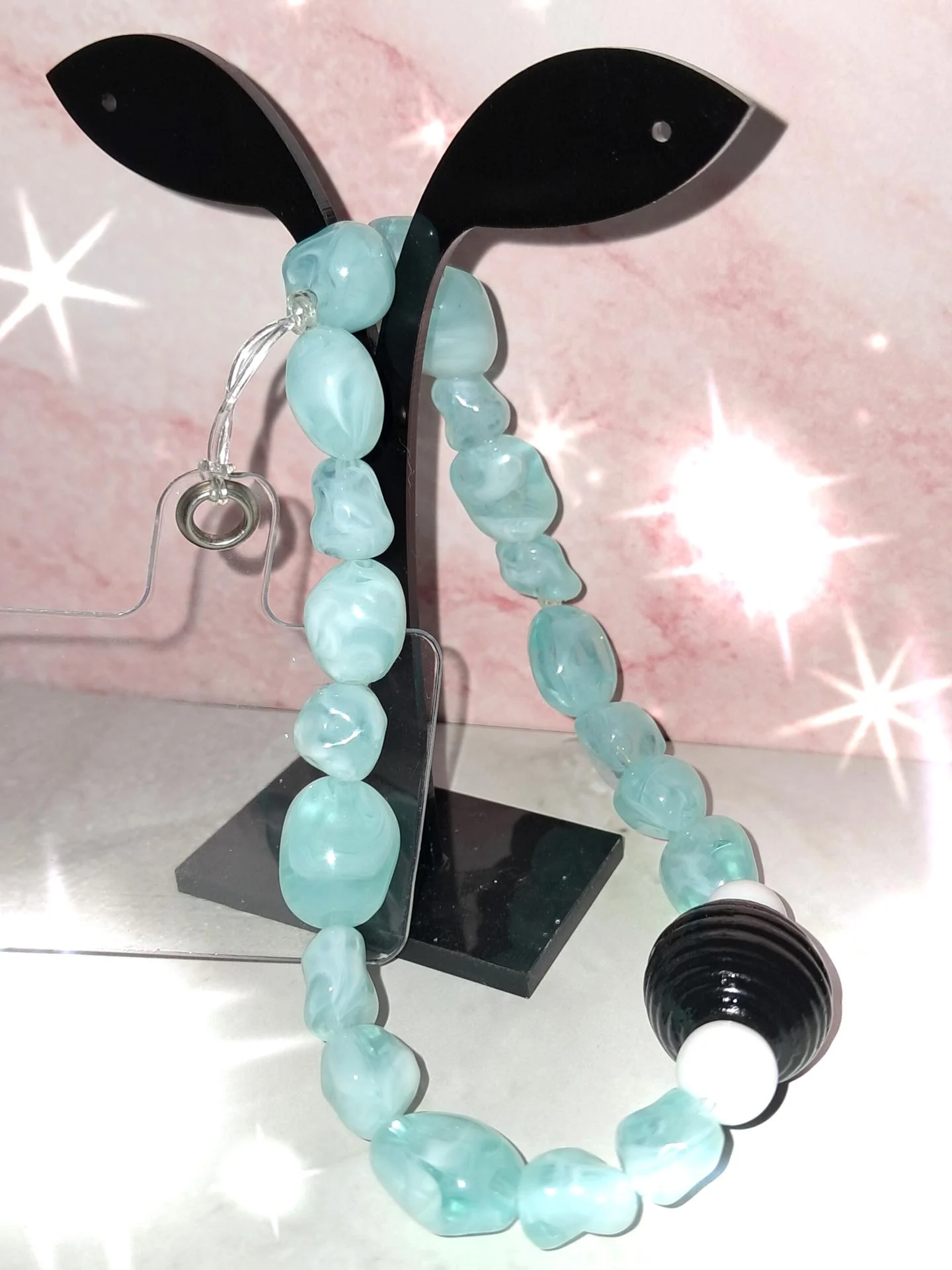 Bijou de portable en perles d'acrylique bleu lagon & perles en bois noir vernis accompagné de deux perles blanches.Accessoires tendance,solide et lumineux