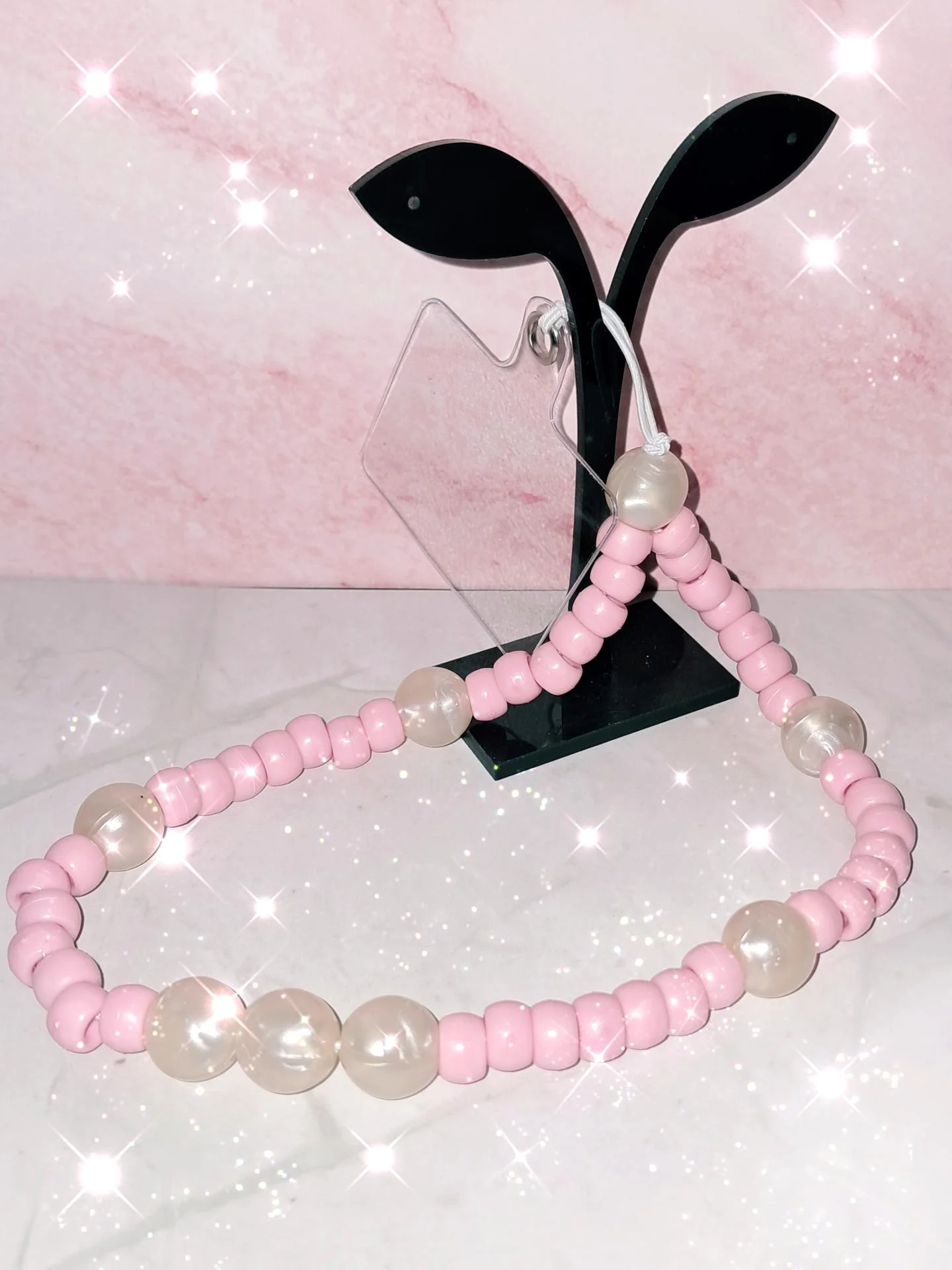 Bijou de téléphone portable original,unique et fait main,de couleur rose tendre & blanc nacré en perles d'acryliques .S'accroche facilement à toute coque compatible.