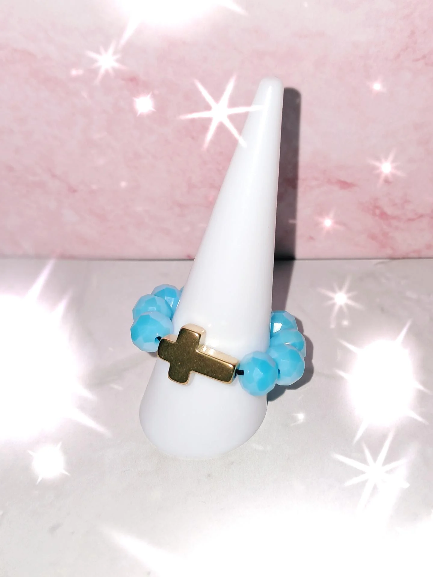 Ce joli dizainier en perle de verre bleu ciel facettée,accompagné de sa croix en hématite doré. Bel objet pour prière chrétienne, un véritable passe partout.Il vous protègera, renforcera votre foi. Un beau cadeau à offrir .